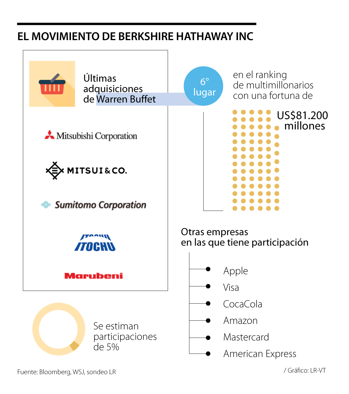 El accionista mayoritario de Berkshire Hathaway anunció su inversión en seis empresas japonesas: Mitsubishi Corp., Mitsui Mitsy & Co., Sumitomo Corp., Itochu Corp. y Marubeni Corp, se estima que habría adquirido participaciones de 5% según comenta Bloomberg.