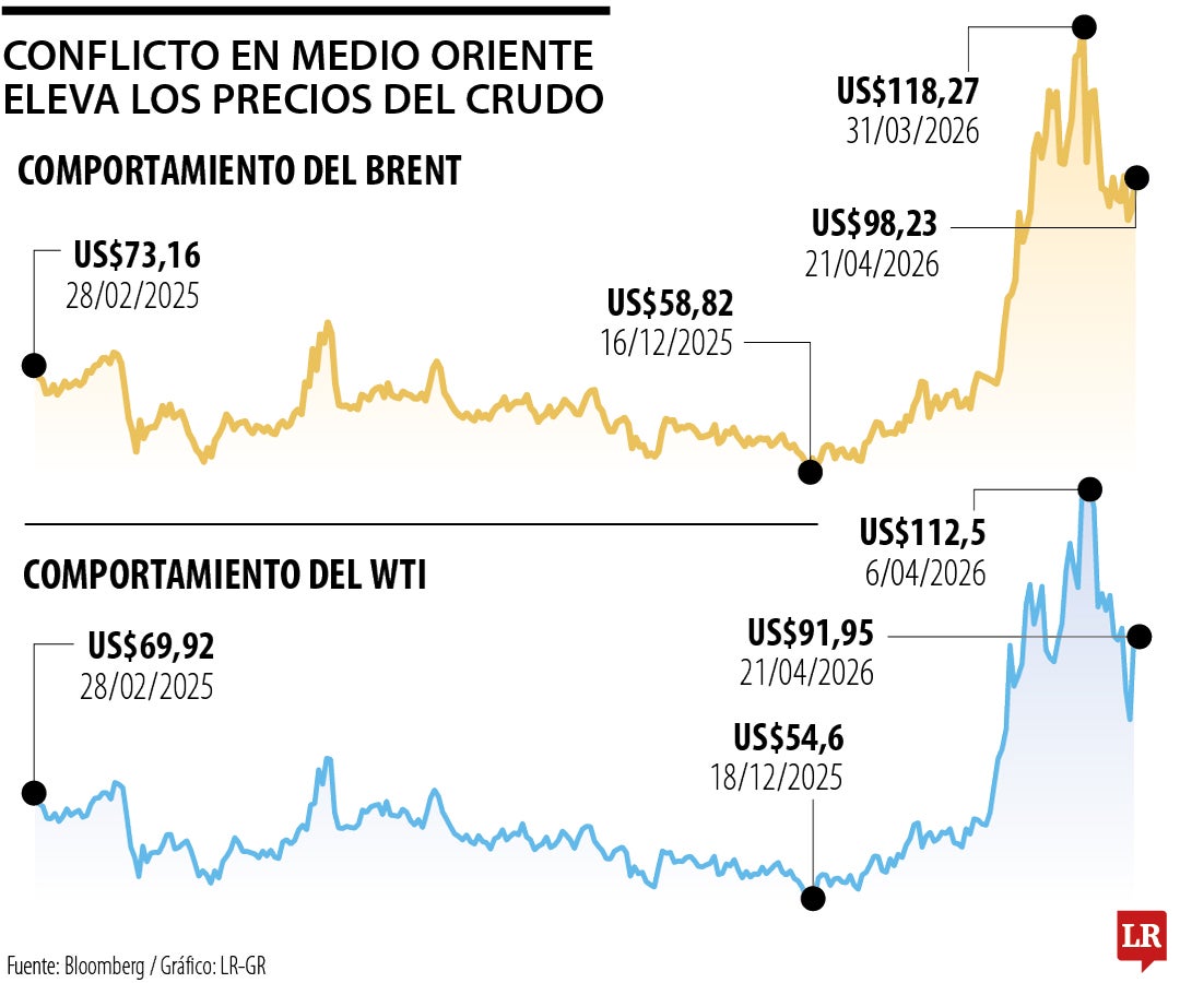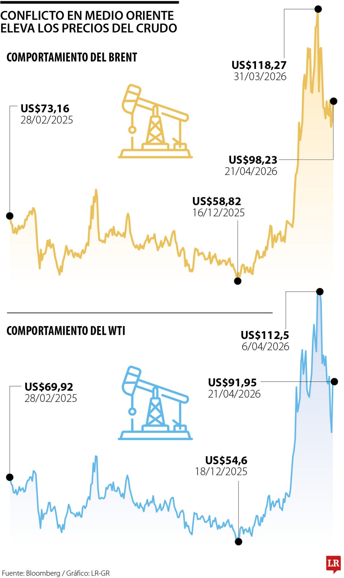 Desde que empezó la guerra, los futuros del petróleo han subido cerca de 30%. En marzo llegaron a casi US$120 por barril, pero luego bajaron y este martes bajaron en medio de expectativas de un posible acuerdo entre Estados Unidos e Irán.