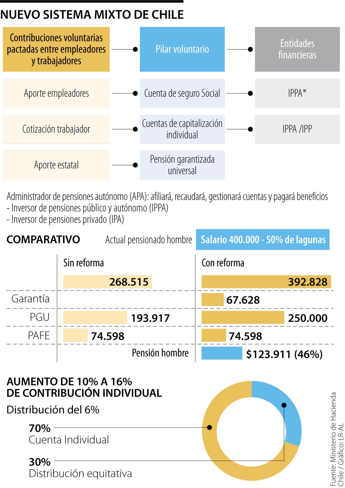 La reforma pensional de Chile contempla algunos pilares similares al sistema actual de pensiones en Colombia, pues también es de carácter mixto, las personas pueden elegir si pertenecer a un régimen privado o público y acá 16% de la cotización corresponde al salario o ingreso percibido, en el que 75% está a cargo del empleador y 25% del trabajador.