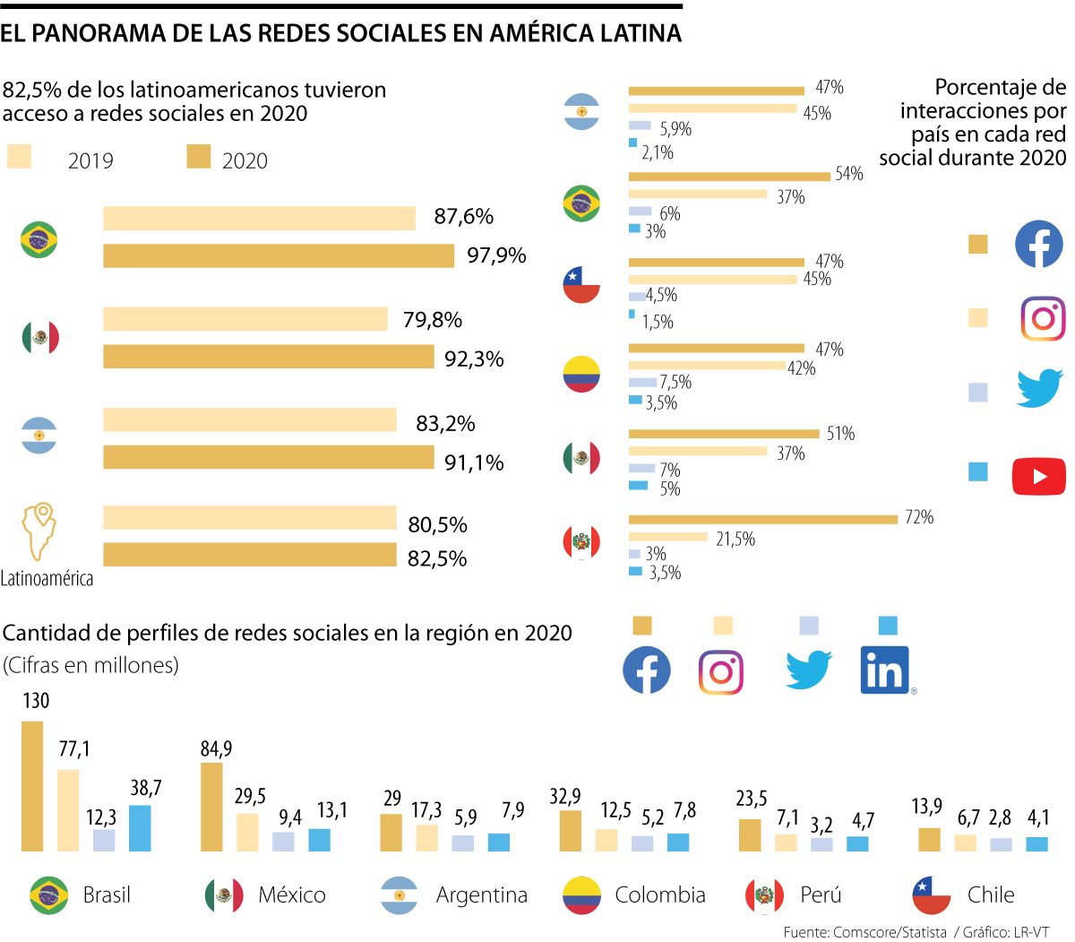 De acuerdo con el más reciente informe de Comscore sobre el uso de redes sociales en América Latina, cerca de 82% de los latinos tuvieron acceso a redes sociales durante 2020, lo que representó un aumento de 1,6% desde el registro de cierre de 2019 cuando fue de 80,9%.