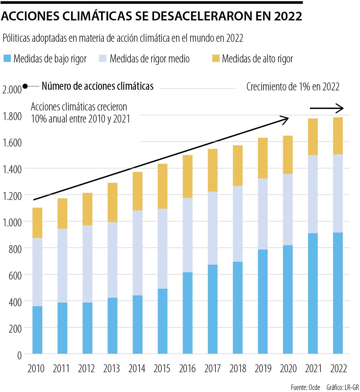 El Monitor de Acción Climática de la Ocde 2023 evidenció que en 2022 las medidas de política climática de los países que producen dos tercios de las emisiones de gases de efecto invernadero aumentaron 1%, lo que es considerado por la entidad como una desaceleración, teniendo en cuenta que entre 2010 y 2021 el incremento fue de 10% cada año.
