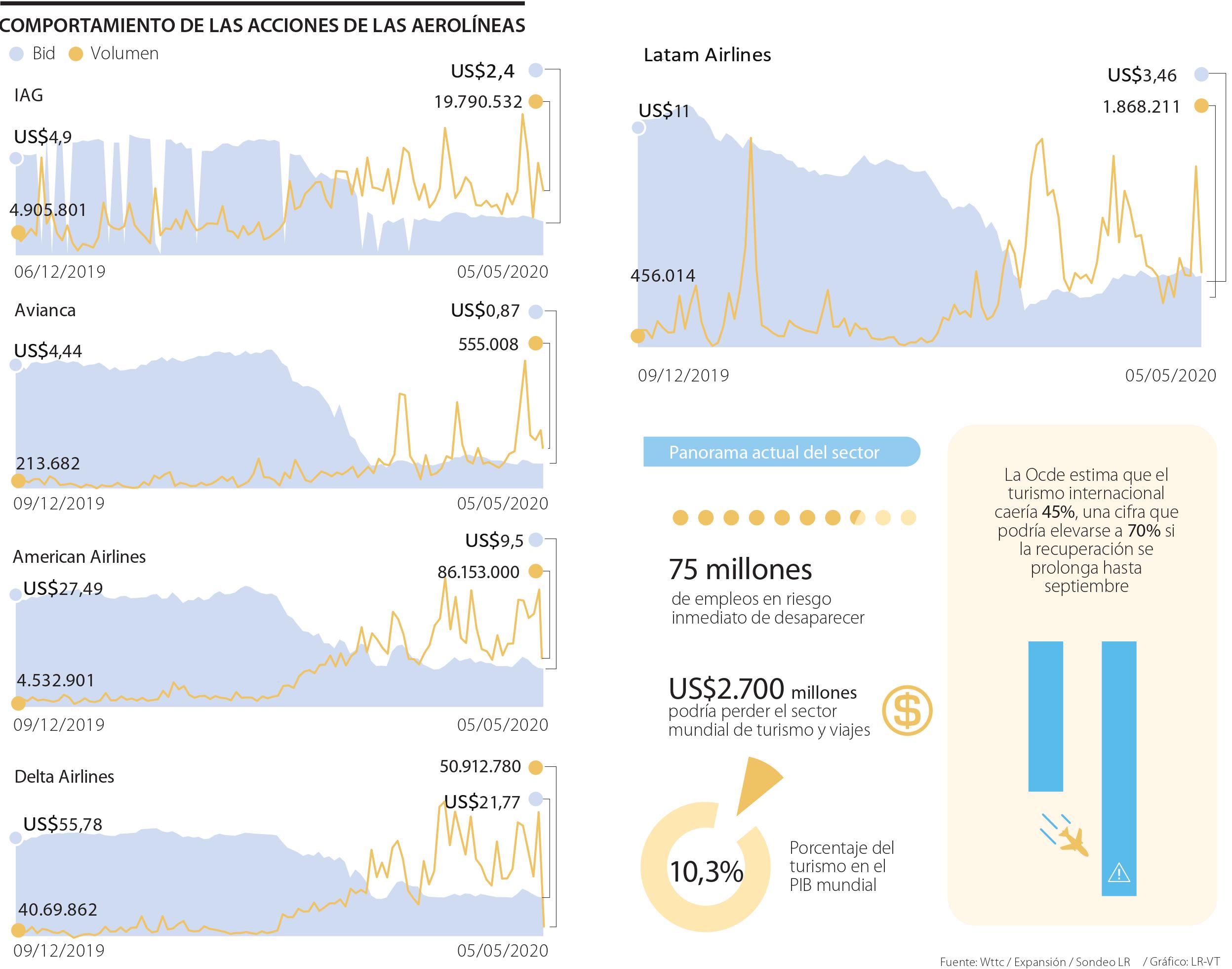 Pese a que se están empezando a trazar hojas de ruta acerca de la reacctivación del sector y que hay en marcha planes por parte de algunos gobiernos para rescatar a las aerolíneas, como es el caso de TAP-Air Portugal, Lufthansa o de Norwegian Air, el choque bursátil que registra el sector continuará debido a que aún no se tiene una fecha sobre la reactivación, según medios internacionales.