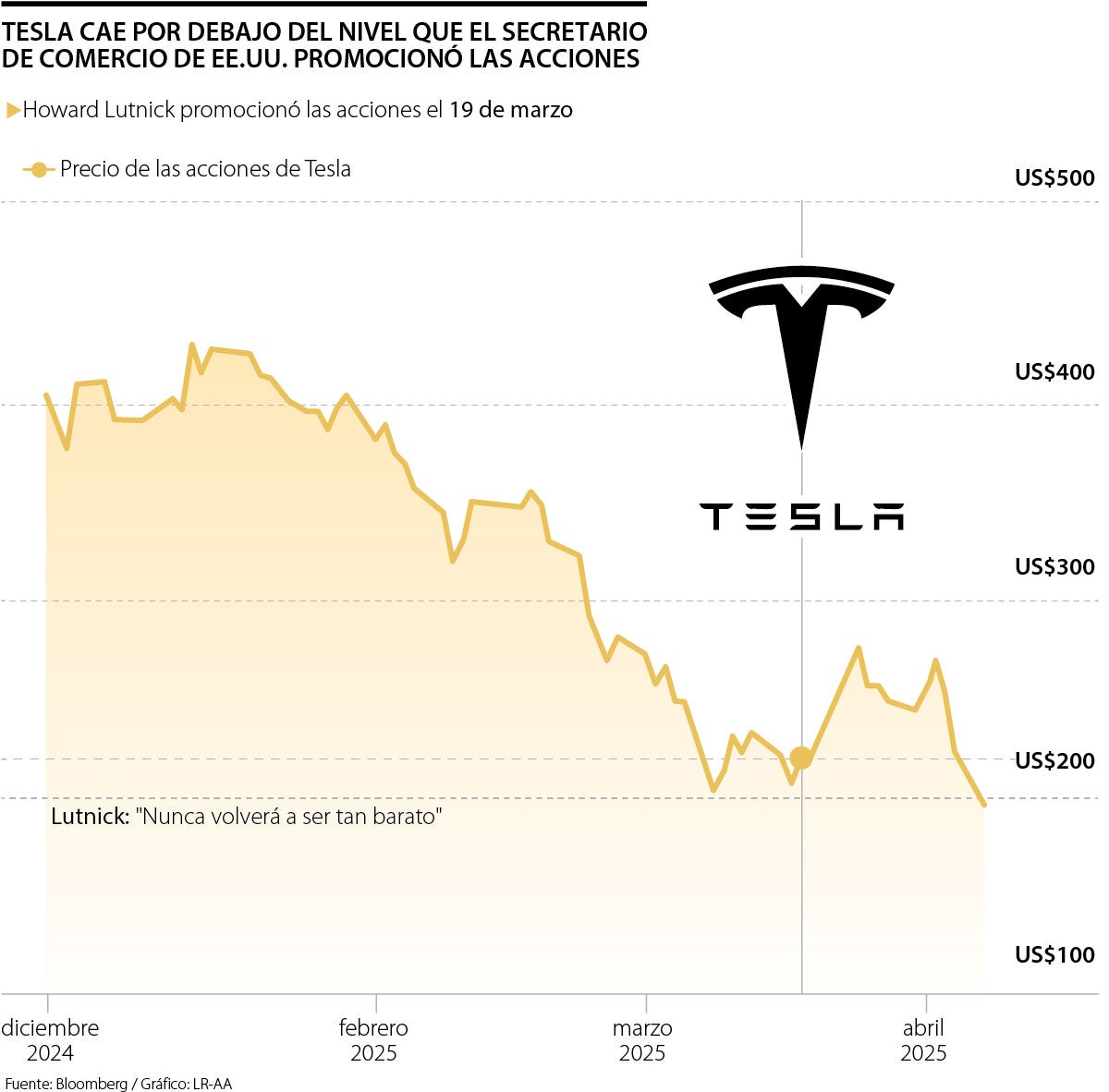 Las acciones se desplomaron más de 10% hasta los US$214.800 en medio de una caída generalizada en los mercados bursátiles mundiales. Lutnick dijo durante una entrevista en Fox News el 19 de marzo, cuando Tesla cerró a US$235.860, que los espectadores deberían comprar las acciones, diciendo que “nunca volverán a estar tan baratas”. El director ejecutivo, Elon Musk, dijo a los empleados de Tesla al día siguiente que debían conservar sus acciones.