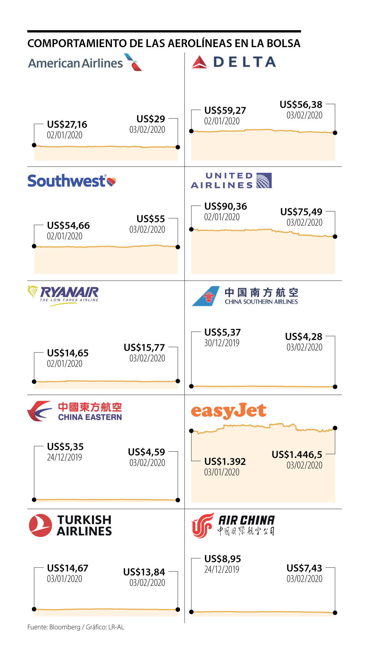 Además de la suspensión de rutas o la disminución de la oferta de vuelos al gigante asiático, las aerolíneas con mayor exposición al mercado chino han visto recortada su cotización. Por ejemplo, China Southern Airline cayó 1,61% y China Eastern Airlines se desplomó 2,23%. Ambas compañías cerraron en rojo y otras tuvieron un alza leve como fue el caso Air China que subió 0,16%.