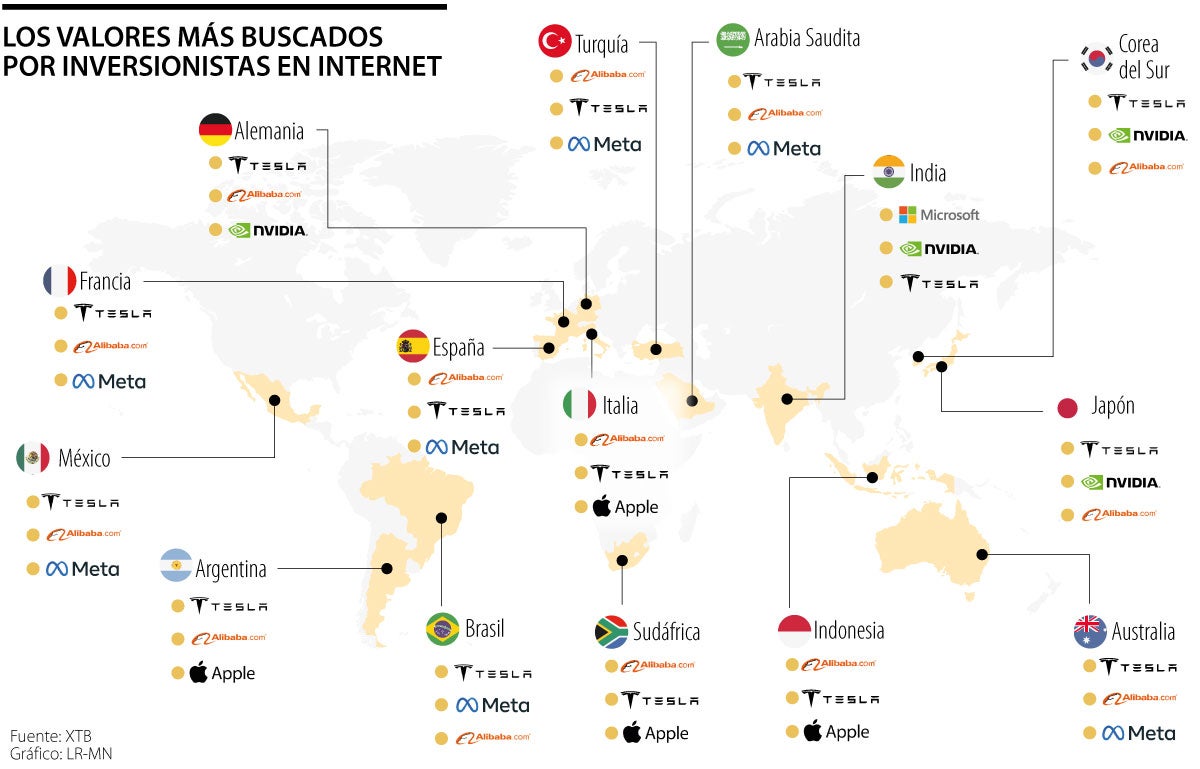 Los inversionistas lo tienen claro a la hora de escoger sus acciones favoritas, o al menos, las que más interés suscitan y provocan búsquedas en internet. El broker XTB ha analizado los datos de las 50 empresas de mayor capitalización bursátil mundiales que más se han rastreado en Google en 18 de los países del G20 el último año.