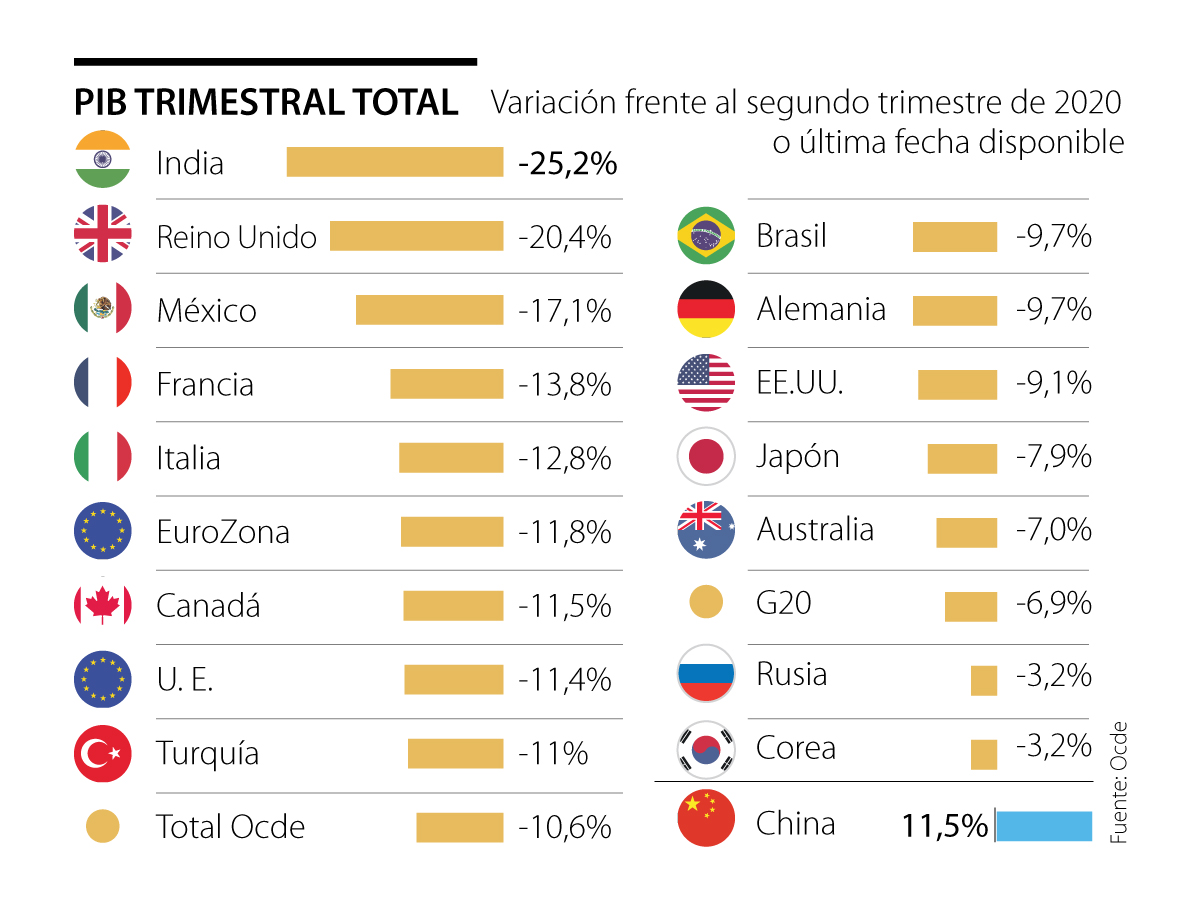 De los países analizados, India fue el más afectado con una variación negativa de 25,2% en su PIB respecto a la cifra del segundo trimestre de 2020; Reino Unido se ubicó en segundo lugar con -20,4% y México cerró el top tres con una reducción de 17,1%.