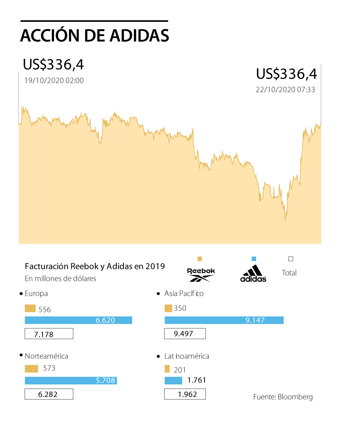 En Europa, las ventas de Reebok facturaron US$556 millones para 2019, mientras que Adidas logró US$6.620 millones. Ese mismo año alcanzó en la Bolsa una revalorización de 59% en el EuroStoxx50.