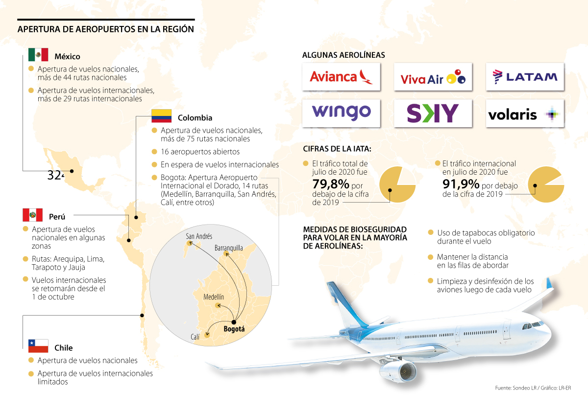 Por otro lado, en Colombia desde el lunes se autorizó la reapertura del Aeropuerto Internacional el Dorado y otros 16 aeropuertos nacionales. Con ello se activarán cerca de 75 rutas locales a diferentes destinos como San Andrés, Medellín, Barranquilla, Cali, entre otros.