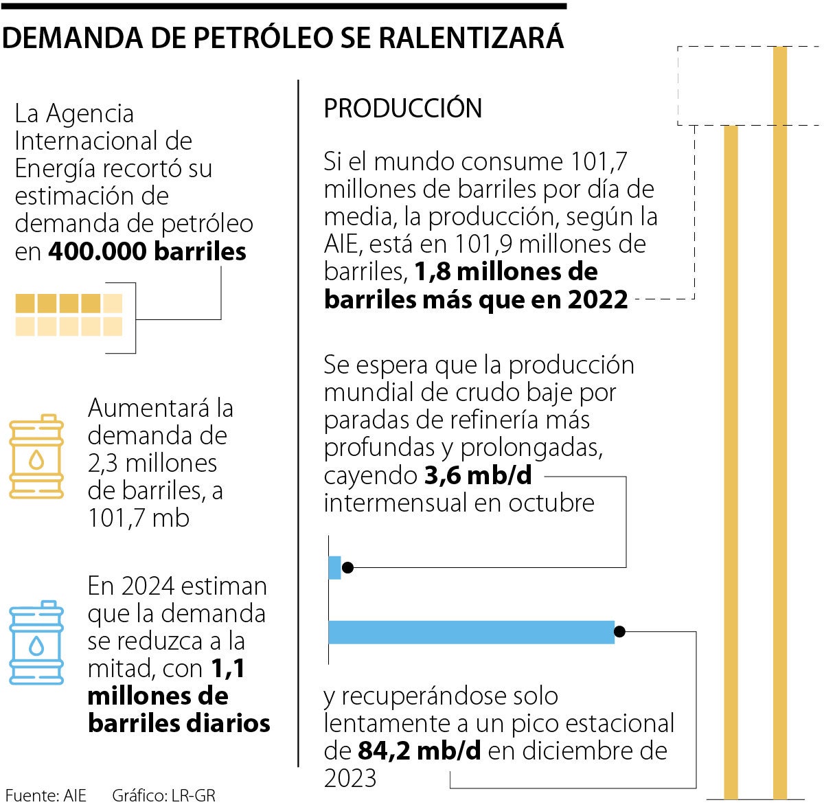 Esto, combinado con la producción récord de Brasil y Guyana junto con los crecientes flujos iraníes, elevará la producción mundial en 1,8 mb/d a 101,9 mb/d en 2023.