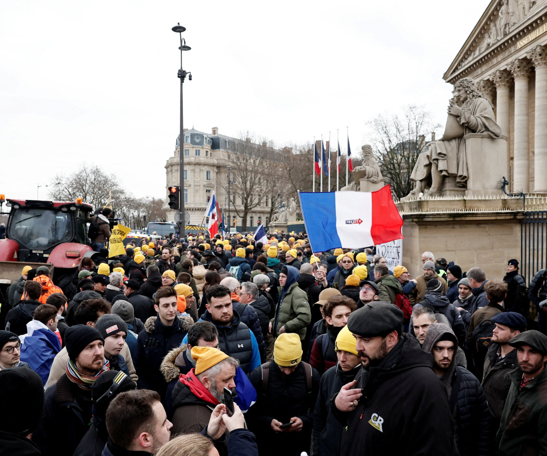 Los agricultores del sindicato derechista Coordination Rurale convocaron las protestas en París ante el temor de que el acuerdo de libre comercio previsto con el bloque Mercosur inunde la UE con importaciones de alimentos baratos.
