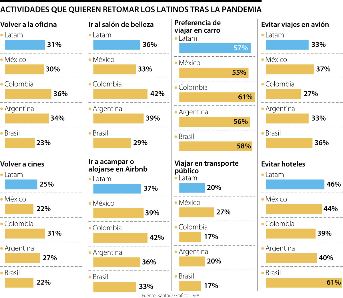 Luego de un año y medio de pandemia, el cambio en la forma en la que la gente se mueve en la nueva normalidad fue sustancial. Al respecto, Kantar publicó un estudio en el que reportó las tendencias y el comportamiento de los habitantes de la región en sectores como el turismo y la movilidad, que muestra que al menos tres de cada 10 latinos desea volver a la oficina o acudir a los bares para el periodo pospandemia.