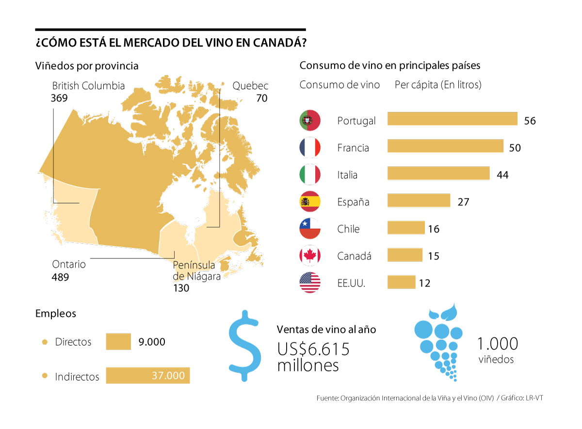 Dicha tendencia se ve reflejada en el consumo per cápita de este país, que al año llega a los 15 litros, situándolo por encima de Estados Unidos, que está en 12 litros por habitante. En el último año Canadá produjo más de 530 millones de litros de vino y sumó ventas por más de US$6.600 millones. Aunque la gran mayoría se vendió en el mercado nacional, dos millones de litros fueron exportados principalmente al mercado asiático, donde China, Corea del sur y Japón fueron los principales compradores.