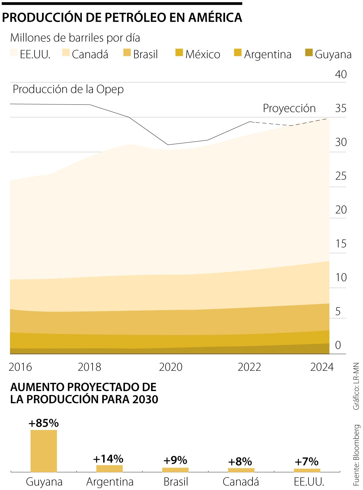 Esa nueva producción compensará casi por completo los recortes de producción que la Opep, e incluso su aliado Rusia, están realizando a partir de mayo mientras buscan apuntalar los precios mundiales del petróleo. “El hemisferio occidental es la fuente de suministro segura que el mundo necesita a mediano plazo para evitar que los precios del petróleo se disparen por las nubes”, dijo Schreiner Parker, director para América Latina de Rystad Energy. “Brasil, México, Guyana, Argentina e incluso Venezuela verán aumentos de producción este año que ayudarán a apuntalar el suministro frente a los continuos recortes de la Opep”.