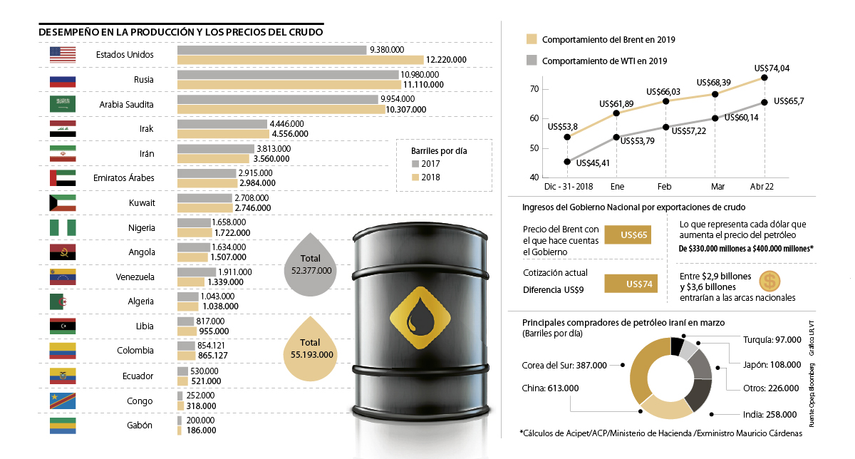 Los recortes programados de la Opep, la escasez en las exportaciones venezolanas y las tensiones geopolíticas que sostienen Estados Unidos e Irán son el caldo de cultivo perfecto para que el precio del petróleo se dispare rápidamente. Ayer, con el anuncio de Donald Trump de prohibirle a un grupo de países la importación de crudo iraní, se registró un nuevo récord, llevando el Brent a los US$74,04 (un alza de US$2,07 o 2,88%), el nivel más alto desde noviembre de 2018 y un aumento de 38,2% de su valor en lo que va de año.