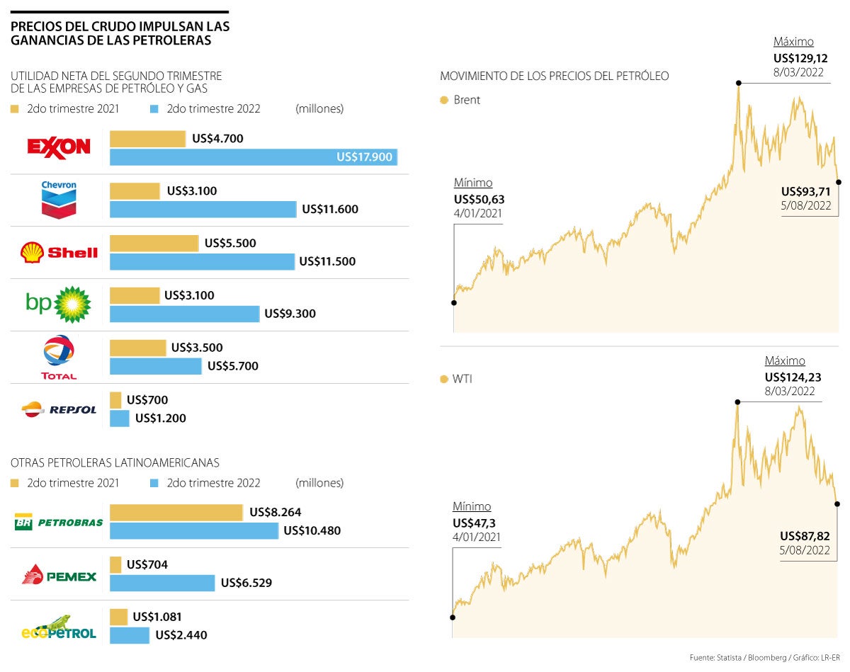 Los precios internacionales del petróleo se dispararon este año por cuenta de la reactivación económica mundial tras la crisis por el covid-19. Además, la guerra en Ucrania también ayudó a impulsar los precios del crudo a máximos de hace varios años. Estos aumentos de los precios del petróleo también impulsaron las ganancias de las grandes compañías petroleras del mundo.