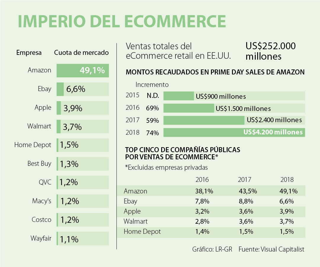 Con este panorama, la compañía de comercio en línea obtiene casi la mitad del monto de las ventas que deja este sector en EE.UU. equivalente a US$252.000 millones, lo cual es más del doble si se llegara a juntar, la participación que tienen compañías como eBay, Walmart, Best Buy, Apple, Home Depot, entre otras.