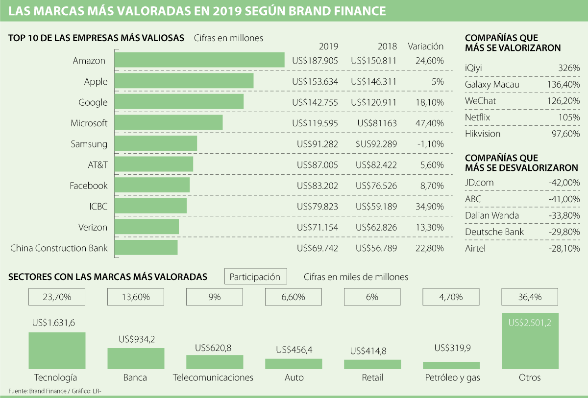 De acuerdo con el último informe presentado por Brand Finance de las 500 marcas más valiosas del planeta, los titanes tecnológicos siguen liderando el escalafón con los primeros seis lugares y una participación de 23,7% en la lista general. Amazon (US$187.905 millones), Apple (US$153.634 millones) y Google (US$142.755 millones), se mantuvieron en el podio.