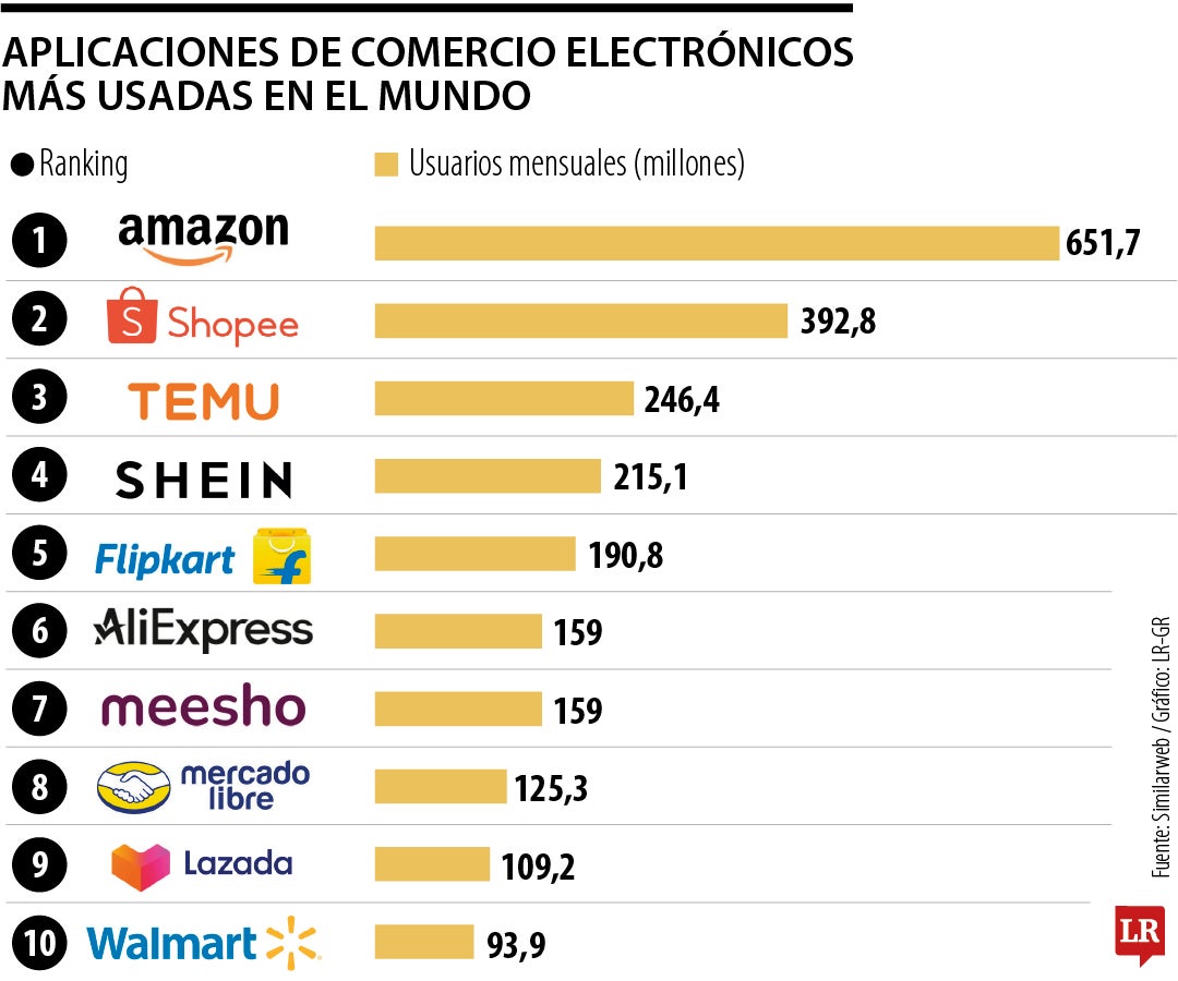 El primer puesto fue para Amazon con un promedio de usuarios mensuales de 651,7 millones, el segundo lugar fue ocupado por Shopee con 392,7 millones y el podio fue completado por Temu con 246,4 millones.