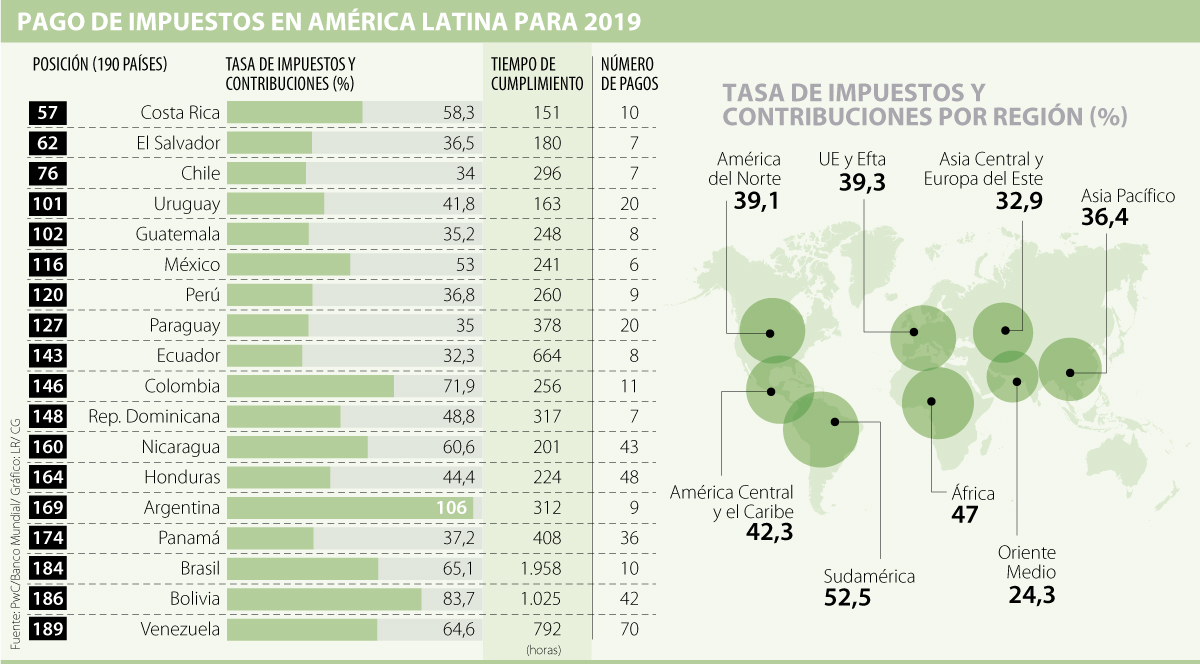 El país con la tasa de impuestos más alta en la región es Argentina, que llega a 106%, seguido de Bolivia, con 83,7%, y Colombia, con 71,9%, en el top tres tanto de Sudamérica como de América Latina y el Caribe, de acuerdo con datos de PwC y el ‘Doing Business 2019’ del Banco Mundial.