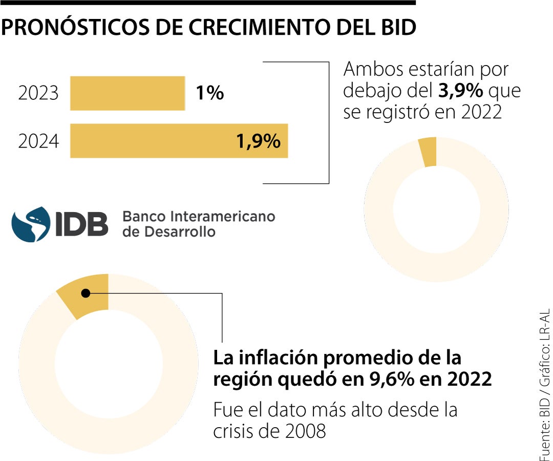 El Banco Interamericano de Desarrollo (BID) publicó el informe macroeconómico de América Latina y el Caribe 2022, en donde pronosticó un crecimiento de 1% para la región en 2023 y de 1,9% para 2024, esto si la crisis bancaria que se está dando en Estados Unidos y Europa no llega a la región.