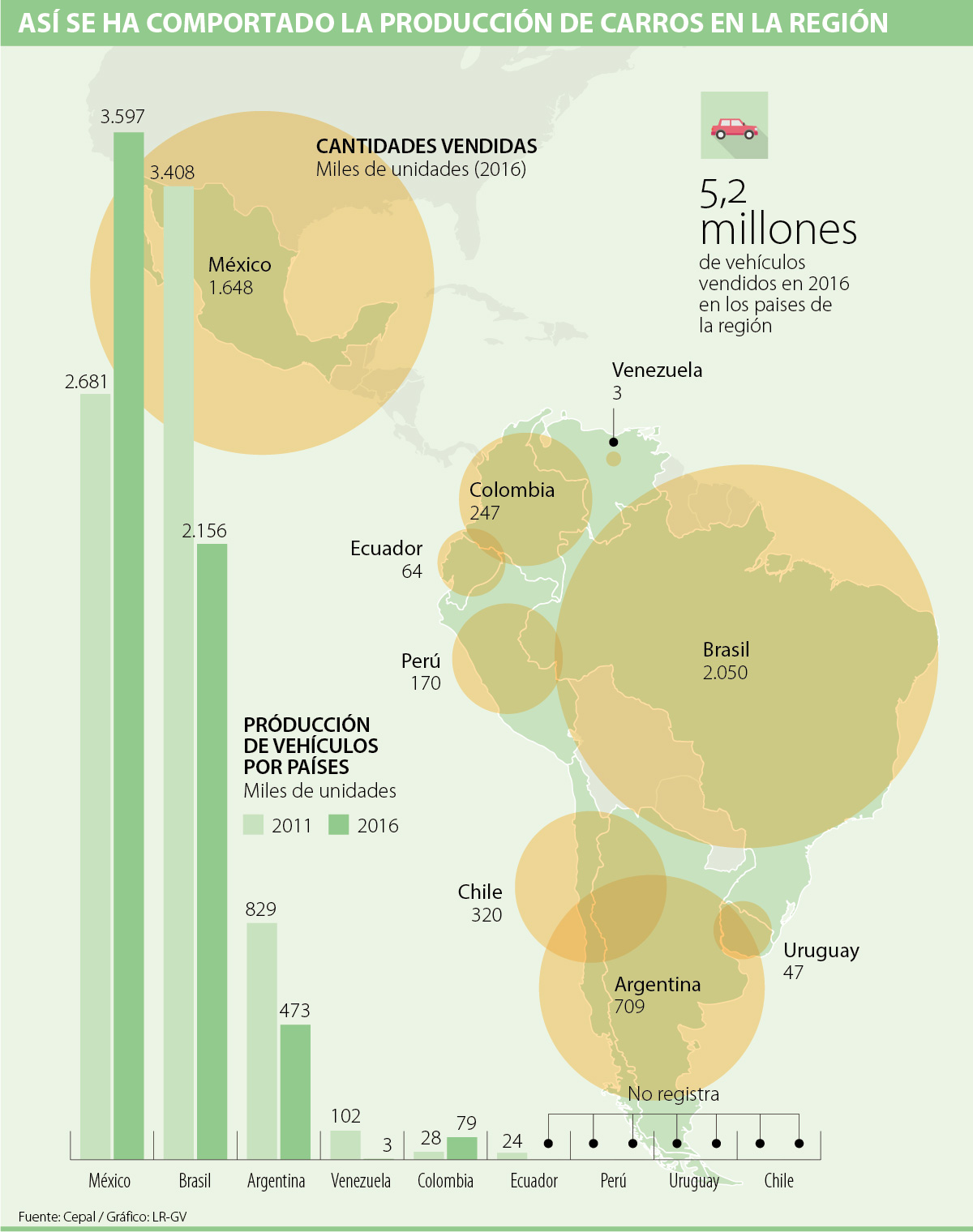 Del total anterior, cabe resaltar la participación de Brasil (3,5 millones de unidades) y México (2,6 millones). De igual manera, por cantidad de unidades le sigue Argentina (473.000) y Colombia (79.000). Según las cifras proporcionadas por la Cepal, Venezuela ocupa el último lugar con 3.000 unidades. No obstante, el organismo indica que no hay datos registrados para Perú, Uruguay y Chile el año pasado.