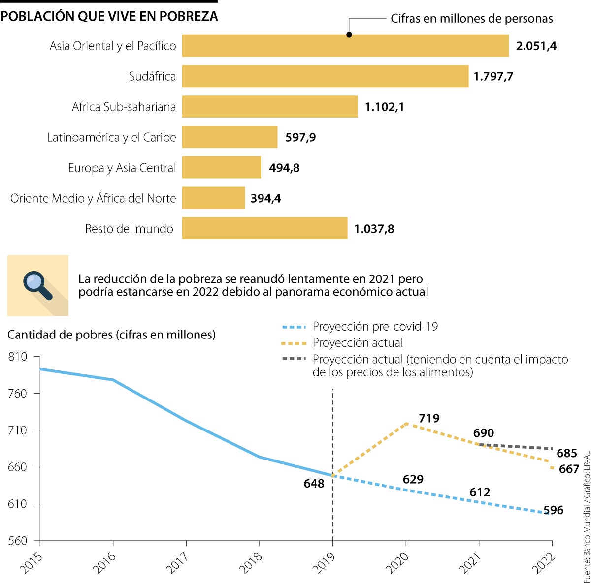 De acuerdo con el informe del Banco Mundial, ‘Pobreza y Prosperidad Compartida’, el mundo no alcanzaría el objetivo propuesto para 2030 de terminar con la pobreza extrema, ya que la pandemia generó un gran retroceso que empujó a 70 millones de personas a esta situación de vulnerabilidad. Además, el panorama económico actual amenaza con empeorar la situación de pobreza extrema en el mundo.