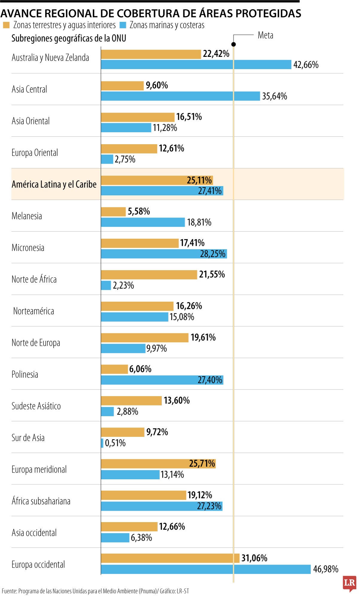 En cuánto al avance de América Latina y el Caribe, lleva 25,11% de avance en cobertura de áreas terrestres protegidas y 27,41% en zonas marinas y costeras. Esto significa que la región es la quinta más avanzada en la protección de las zonas acuíferas, por detrás de las tres ya mencionadas y Micronesia que tiene un avance de 28,25%.