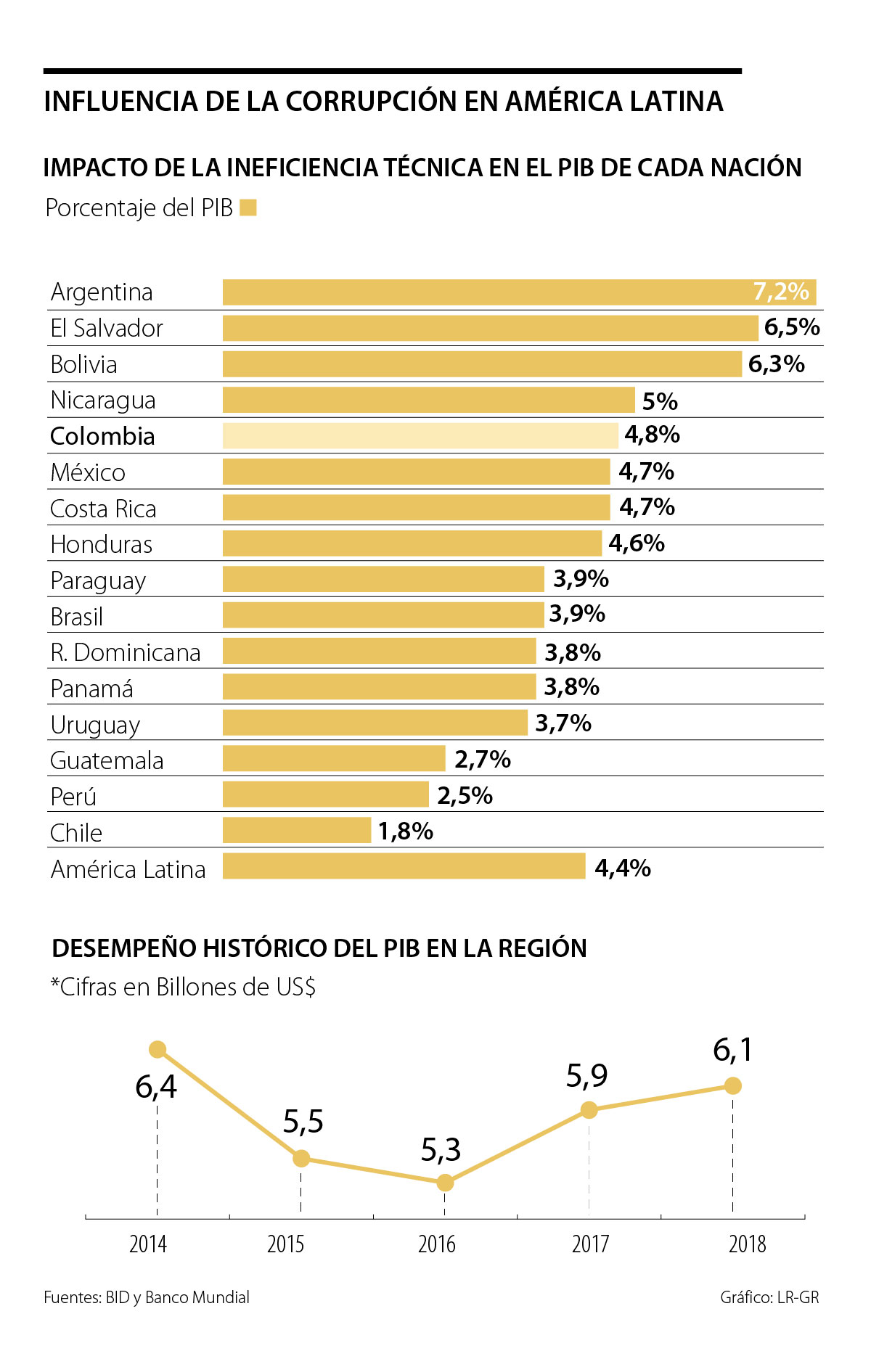 Además de la corrupción, el BID identifica la ineficiencia de los estados como el gran obstáculo para el desarrollo. Los países a los que más afectan estos flagelos en su PIB son Argentina (donde se impacta 7,2% del PIB), El Salvador (6,5%) y Bolivia (6,3%). Colombia está en la quinta posición con un efecto del 4,8% en su PIB.