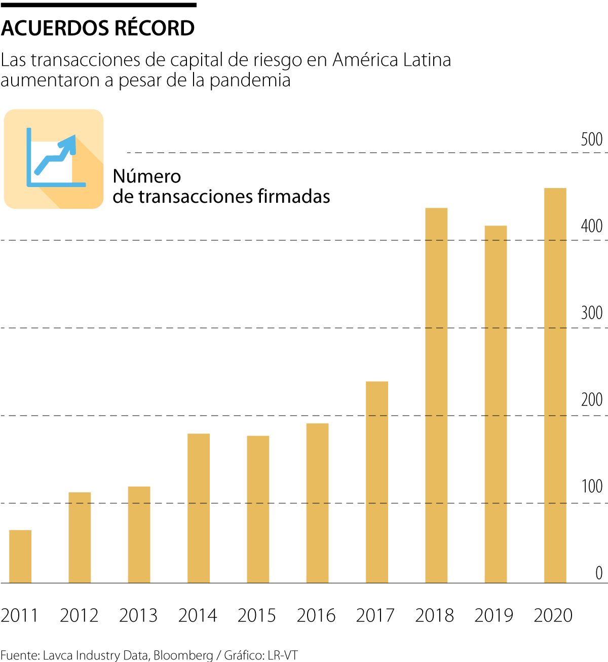 Los inversionistas firmaron 488 acuerdos con empresarios, superando la marca anterior establecida en 2018, según la Asociación Latinoamericana de Capital Privado y Capital Riesgo conocida como Lavca. Si bien la cantidad recaudada, US$4.100 millones, fue aproximadamente 10% inferior a la cifra de 2019, fondos internacionales como SoftBank Group Corp. continuaron invirtiendo, dijo Ivonne Cuello, directora ejecutiva de Lavca.