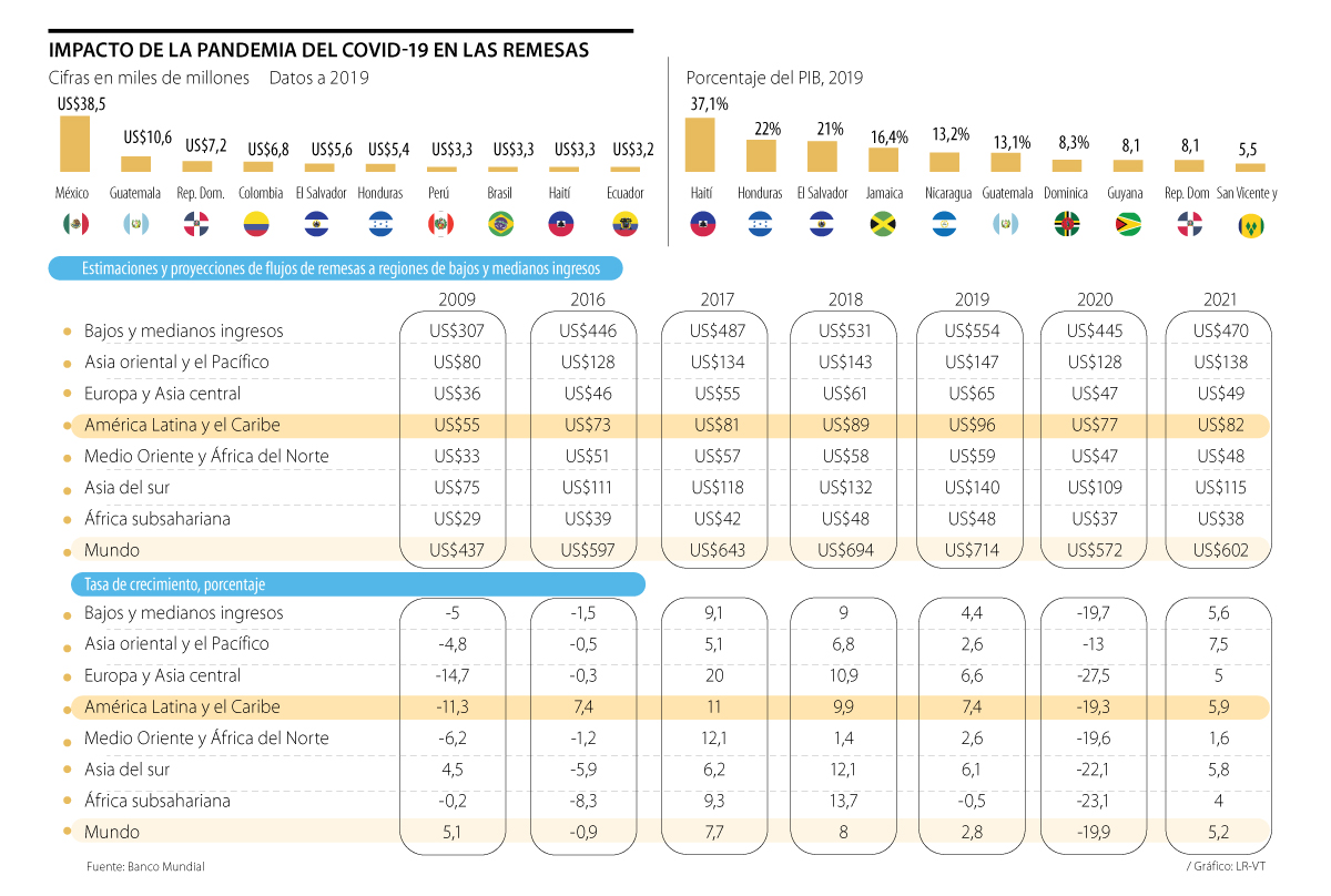 Según el análisis del Banco Mundial, “en 2021, se estima que las remesas a los países de bajos y medianos ingresos se recuperarán y aumentarán en 5,6% a US$470.000 millones y a nivel global crecerán 5,2% el otro año. Sin embargo, las perspectivas para las remesas siguen siendo inciertas como el impacto del Covid-19 en las perspectivas de crecimiento global. Hay que recordar que en el pasado, las remesas han sido anticíclicas, donde los trabajadores envían más dinero a sus hogares en tiempos de crisis y dificultades”.