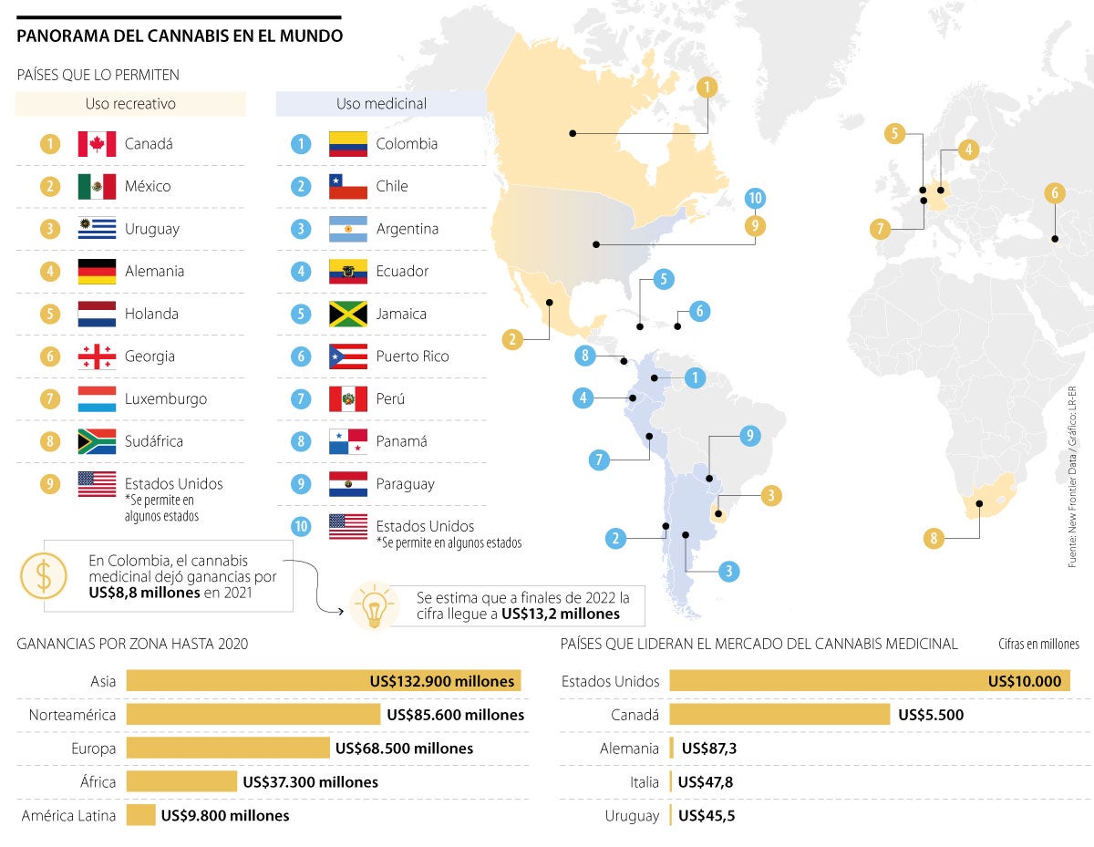 Además, los países líderes en el mercado global de cannabis medicinal son EE.UU., con US$10.000 millones; Canadá, con US$5.500 millones; Alemania, con US$87,3 millones; Italia, con US$47,8 millones y Uruguay, con US$45,5 millones.