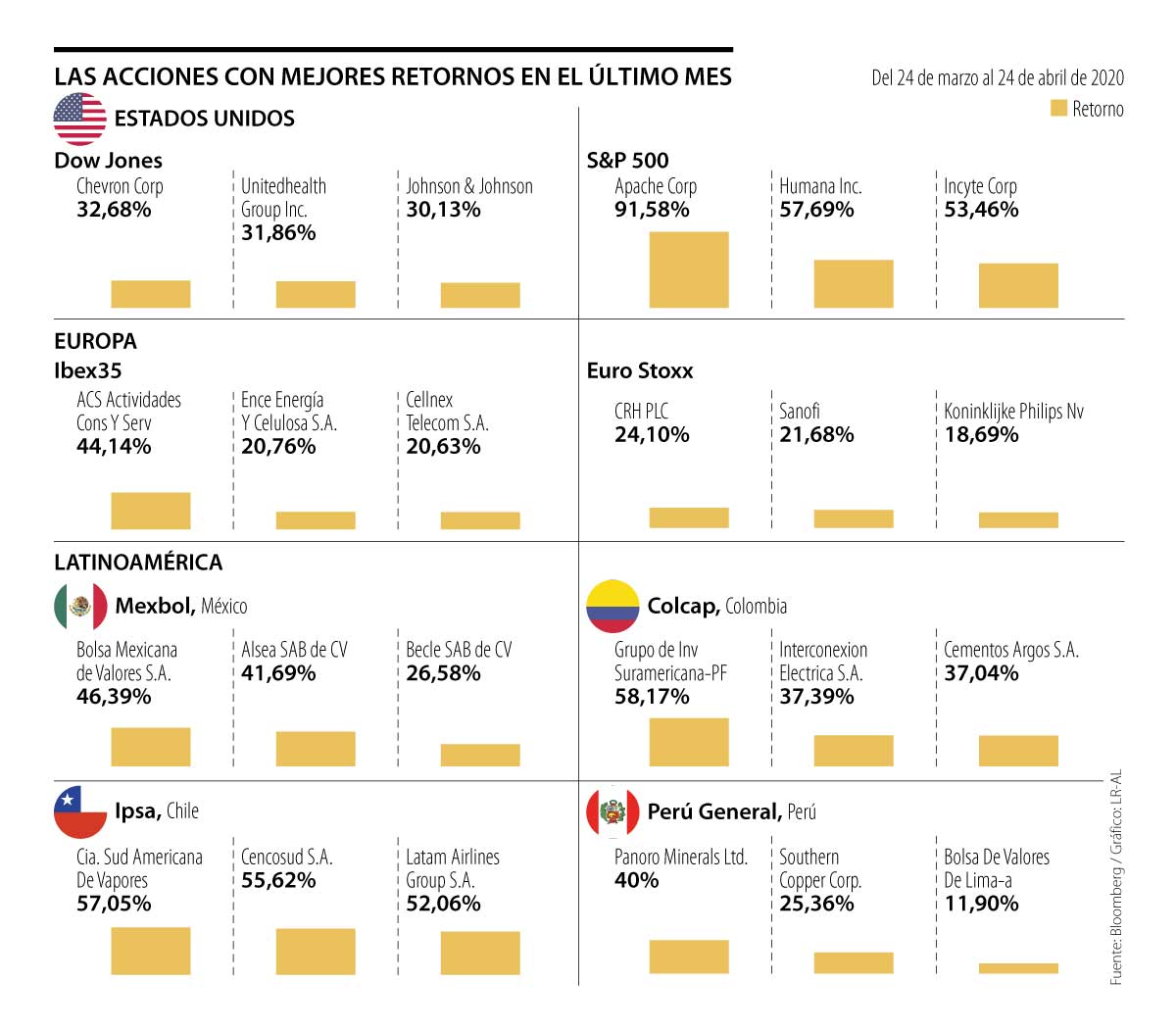 A pesar del ‘crash bursátil’ que se ha registrado en los últimos meses producto de la expansión del covid-19, los títulos de varias compañías han anotado rentabilidades de inversión de hasta 91% en el último mes (del 24 de marzo al 24 de abril de 2020). Este es el caso de Apache Corporation, una firma petrolera y gasífera que se encuentra en el S&P 500.