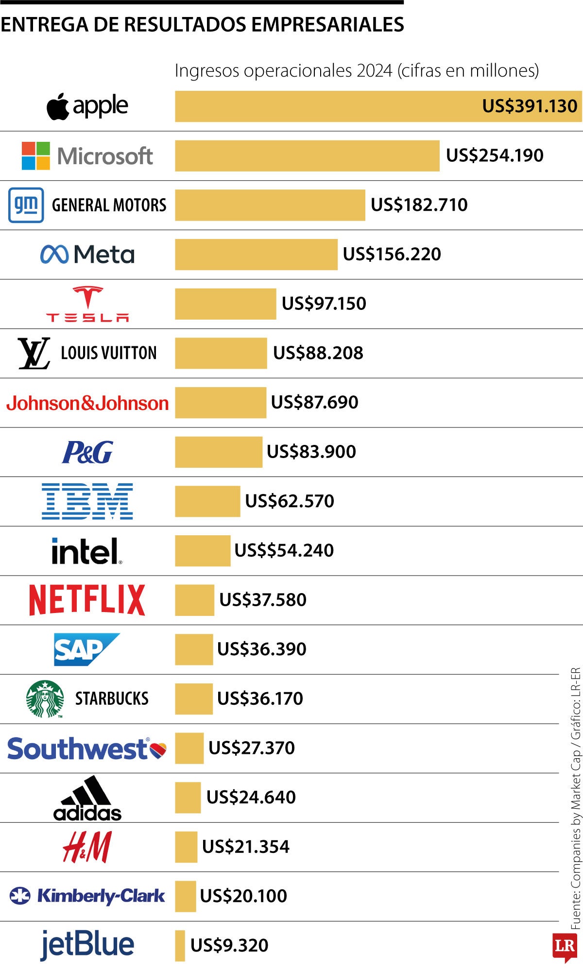La compañía más importante hasta el momento es Apple, cuyo indicador de ingresos operacionales llegó a US$391.130 millones en 2024. De esos, US$124.300 millones correspondieron al último trimestre del año, en el que también se registró una baja en las ventas del iPhone, sobre todo en China, donde la baja fue de 11%.