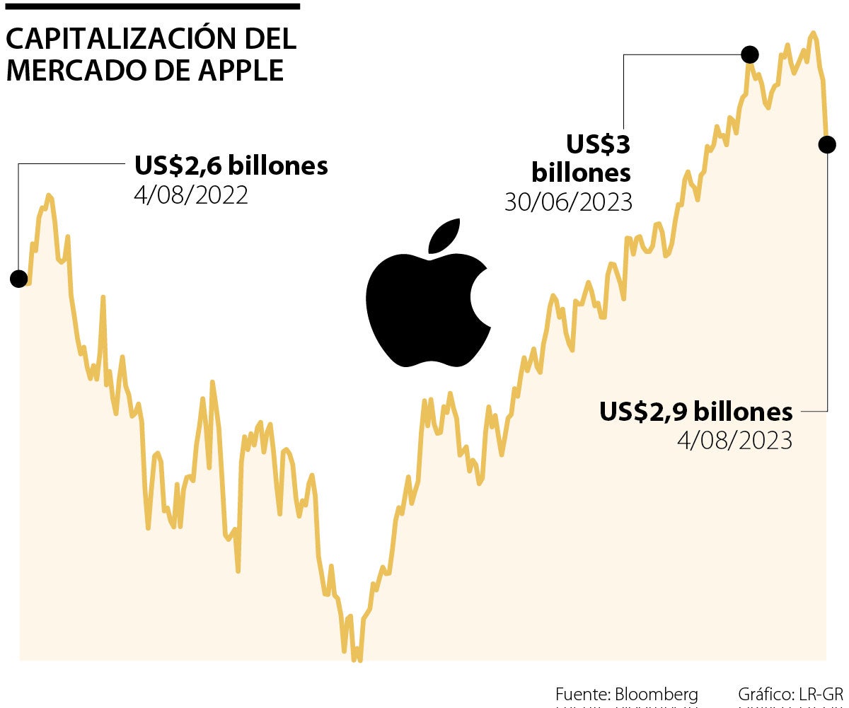 Apple en junio se convirtió en la primera empresa con un valor de US$3 billones. Las acciones han ganado 42% este año en medio de un amplio repunte tecnológico por las esperanzas de los inversores de que el desarrollo de la inteligencia artificial podría proporcionar un nuevo impulso al crecimiento.