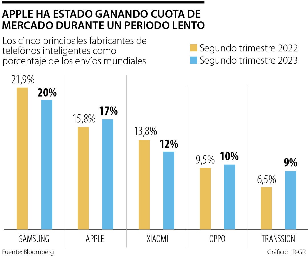 Apple ha capeado la desaceleración de los teléfonos inteligentes mejor que la mayoría de los fabricantes. Aunque sus envíos de teléfonos cayeron un 2% el último trimestre, según IDC, eso fue mejor que la caída del 15% sufrida por Samsung Electronics Co. El desempeño ha ayudado a Apple a ganar algo de participación de mercado.