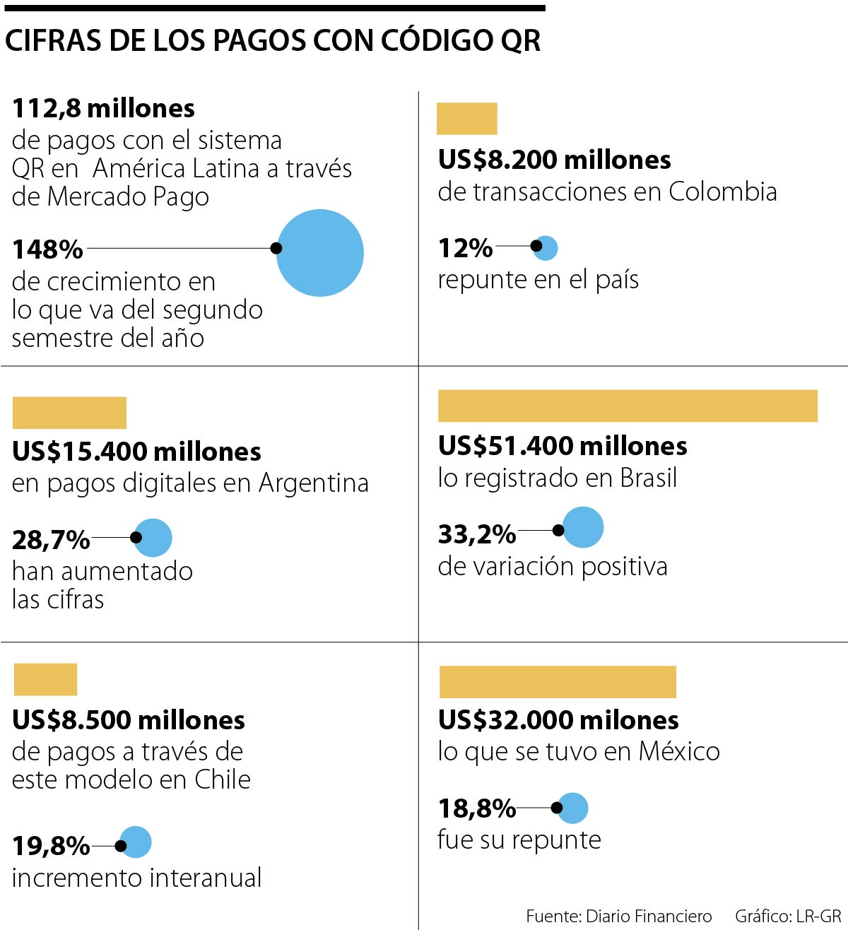 De acuerdo con cifras del Banco de la República a 2020 en Colombia, México, Chile, Argentina y Uruguay, Mercado Pago lidera los pagos con código QR, mientras que, en Brasil, PIX es la principal fuente. Según el documento, en Argentina se realizaron US$15.400 millones en pagos digitales, con una tasa de crecimiento de 28,7% y con 25 millones de usuarios.