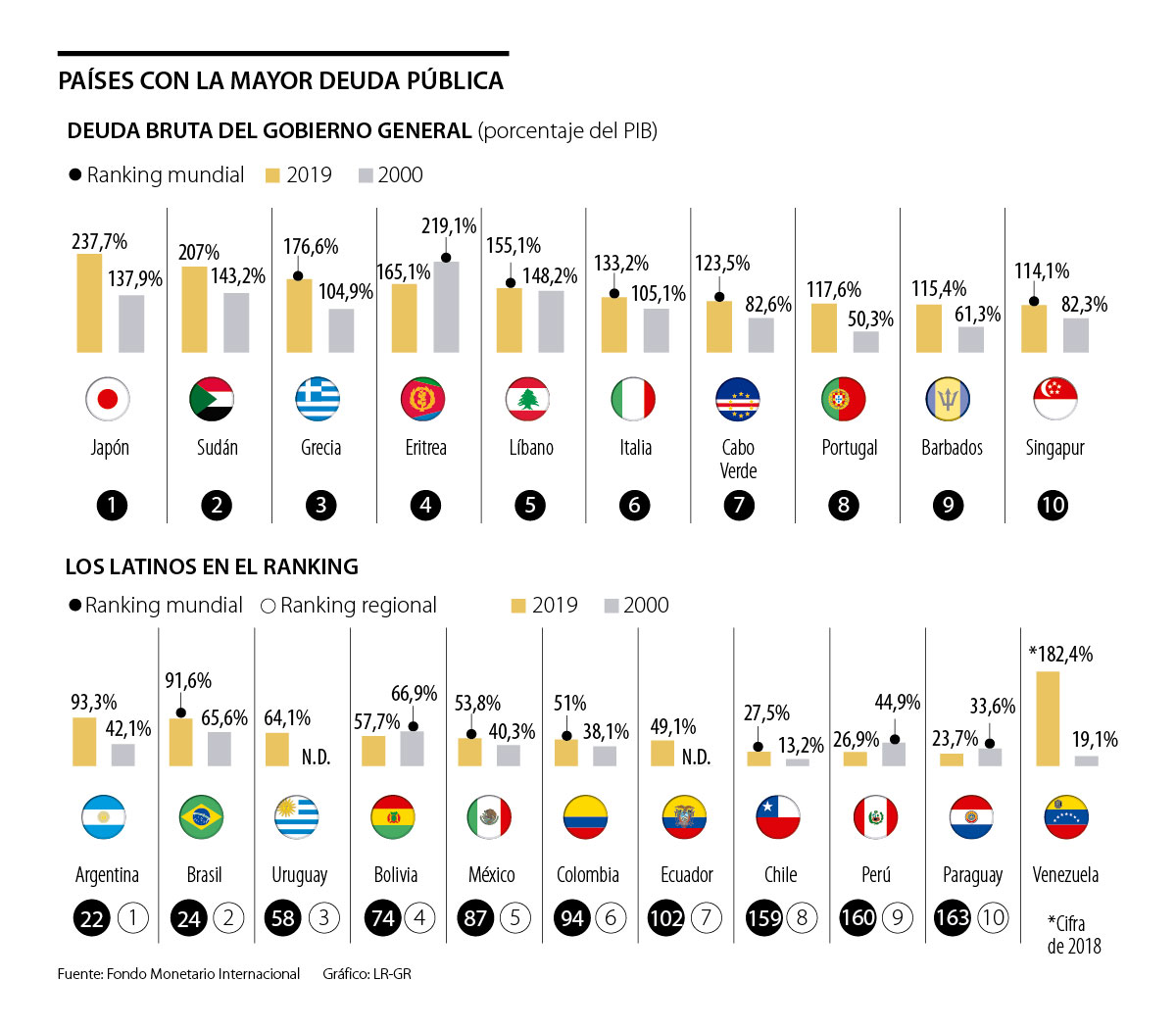 Un informe publicado por el Fondo Monetario Internacional (FMI) expuso los países que acumulan la mayor deuda pública respecto a su Producto Interno Bruto (PIB) en el mundo. En algunos, la deuda se ha duplicado en los últimos años, mientras que en otros la cifra es más reservada. En el caso de América Latina, el primero en figurar en el ranking mundial es Argentina, ocupando el puesto 22 de 186 economías analizadas, mientras que el segundo fue Brasil, en el puesto 24.