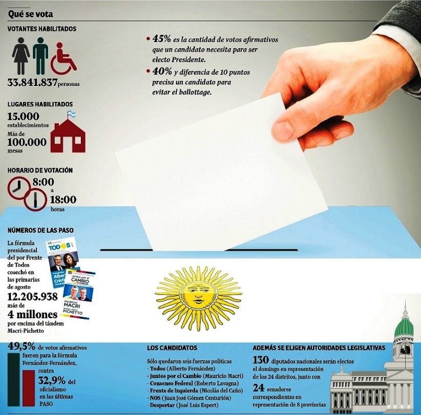 Para acceder al gobierno a partir del 10 de diciembre, la fórmula presidencial que se imponga hoy deberá obtener el 45% de los votos válidos o, bien, el 40% pero con una diferencia de más de 10 puntos sobre el segundo. De no darse ninguna de esas dos situaciones, los dos binomios más votados irán a una segunda vuelta el 24 de noviembre.