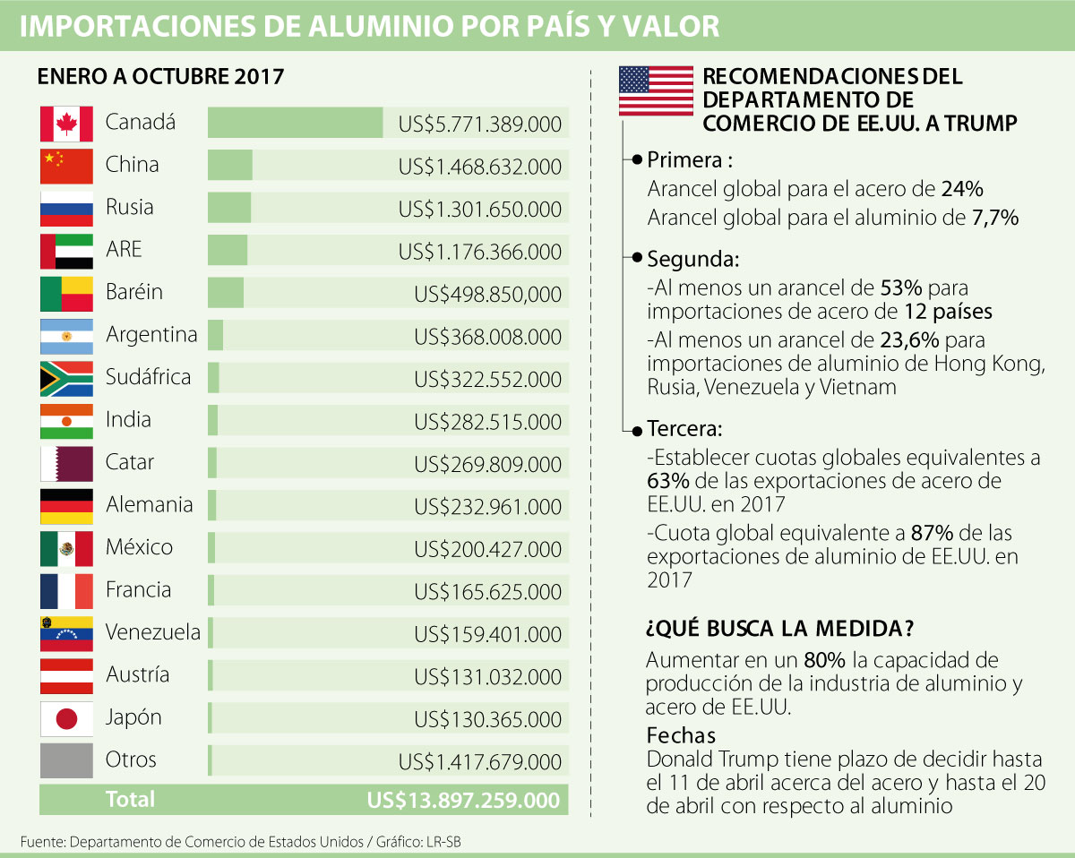 Canadá, China y Rusia son las naciones más afectadas, en el ranking general, debido a que sus exportaciones, entre enero y octubre de 2017, fueron de US$5.771 millones, US$1.468 millones y US$1.301 millones, respectivamente. Estas naciones son las mayores proveedoras de los metales que se utilizan en diferentes sectores de la industria norteamericana, como el automotriz y tecnológico, entre otros.