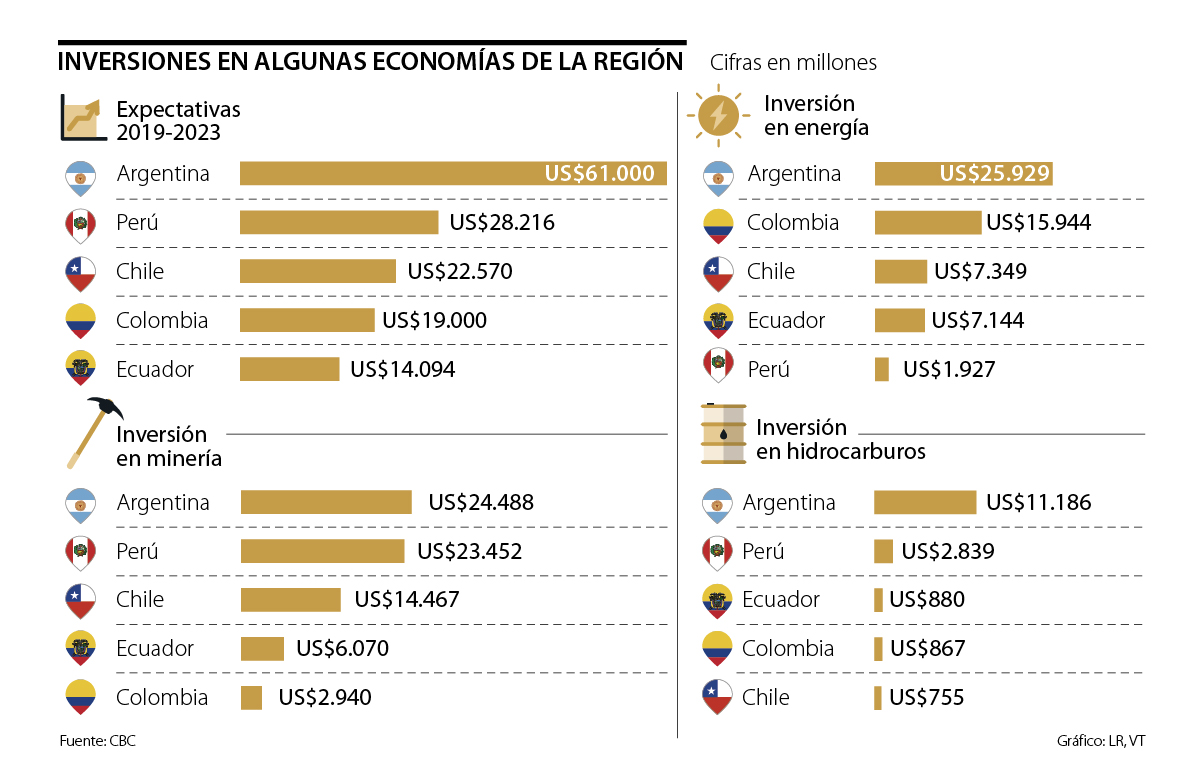 La Corporación de Desarrollo Tecnológico de Bienes de Capital (CBC) -establecida en Chile- dio a conocer cuáles serán los montos de las inversiones para el próximo quinquenio en términos de energía, hidrocarburos y minas para cinco países del continente: Argentina, Chile, Colombia, Ecuador y Perú. Entre estas economías, de acuerdo con la información de la organización, Argentina sería la que más inversión recibiría entre 2019 y 2023.