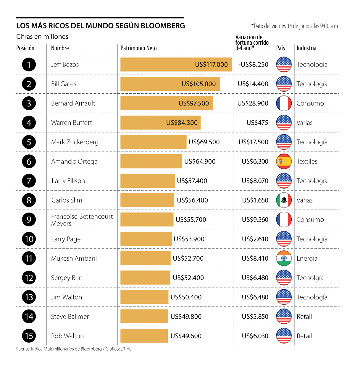 Una de las primeras conclusiones que se derivan de esta comparación es la entrada del empresario francés Bernard Arnault, propietario del grupo de artículos de lujo LVMH, al top tres de los hombres más ricos del mundo. Con una fortuna de US$97.500 millones saca del podio al magnate estadounidense Warren Buffett, quien suma un patrimonio de US$13.200 millones.