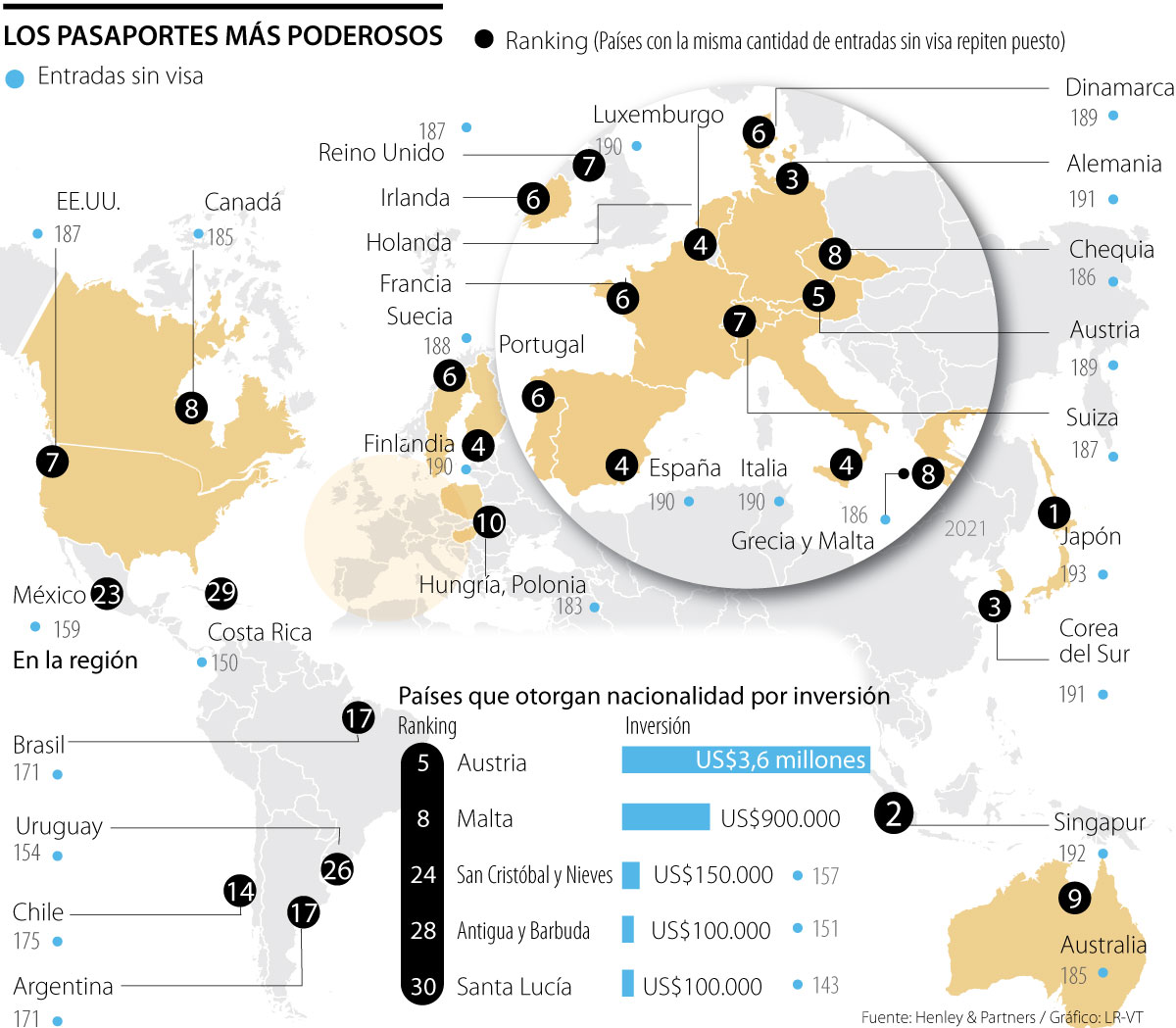 Ciudadanos de Japón y Singapur pueden circular libremente por 99% del planeta, mientras que Austria ofrecen pasaporte a inversores