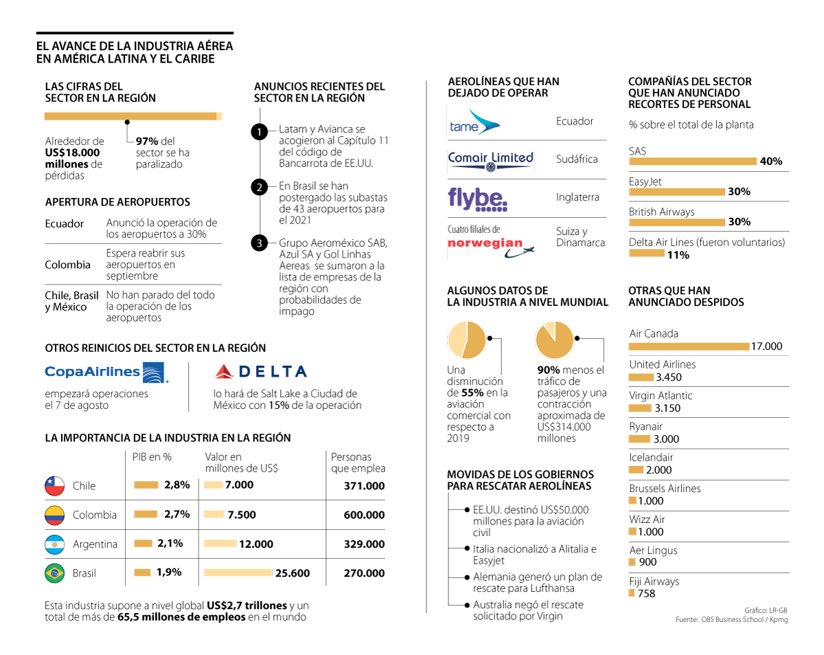 Además de estas noticias, algunas aerolíneas han tenido que recurrir a los despidos masivos para no cerrar. Air Canada informó el despido de 17.000 colaboradores, United Airlines de 3.450, Virgin Atlantic de 3.150 y otros (ver gráfico).