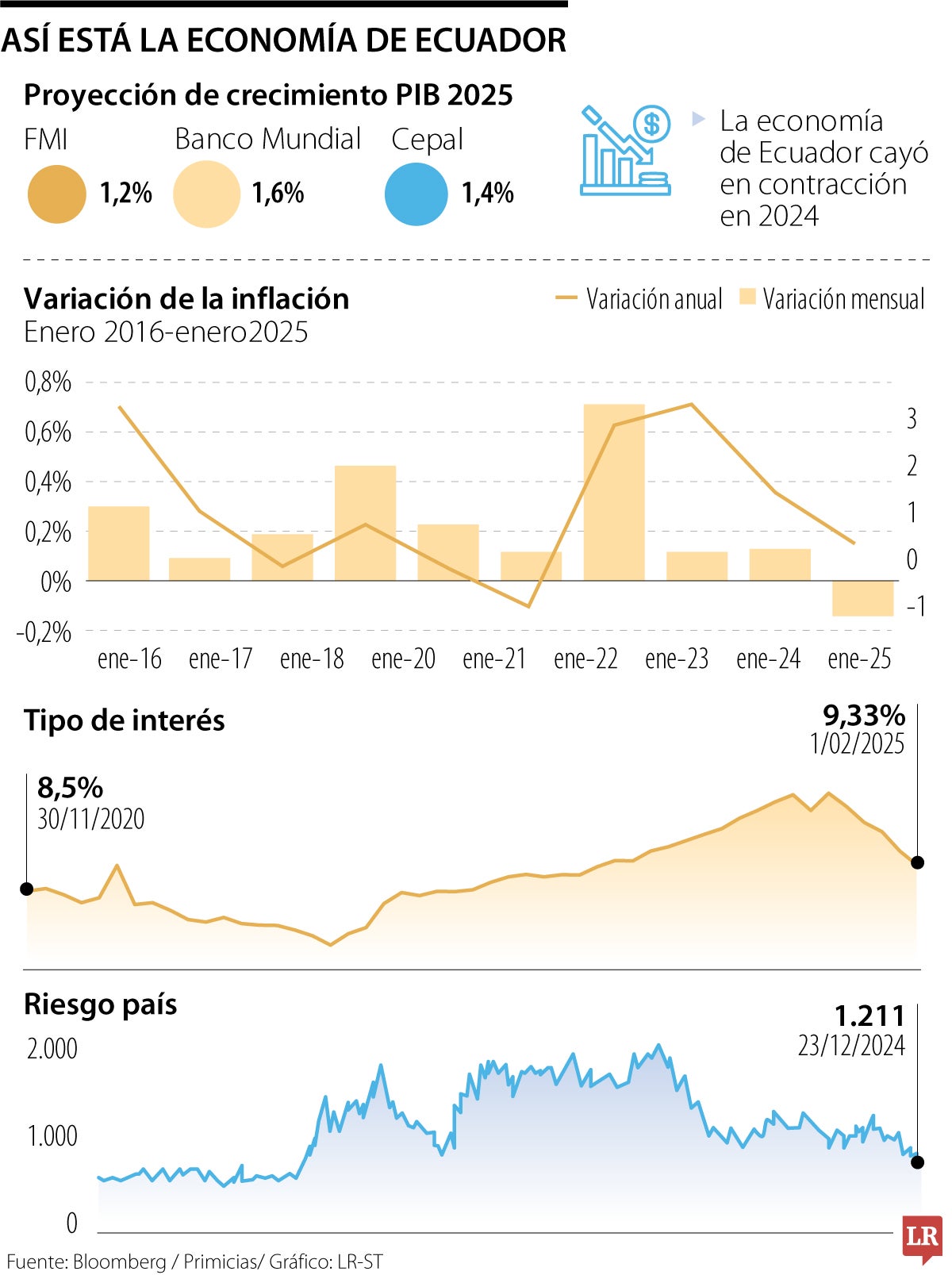 En otros datos macroeconómicos como la inflación, la mensual volvió a ser negativa en enero de 2025: se ubicó en -0,15%, mientras tanto, la anual cerró en 0,26%, según el Inec.