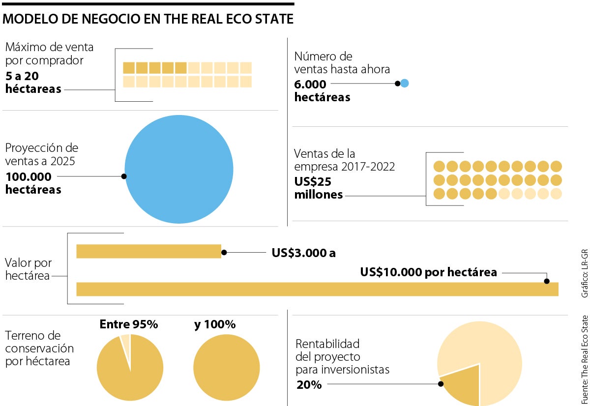 Así que, cuando un inversionista adquiere un terreno a través de The Real Eco State está protegiendo entre 95% y 100% de la superficie respectiva. Sin embargo, invertir en conservación va más allá del altruísmo: con este proyecto los inversionistas obtienen una rentabilidad de 20% promedio anual por los terrenos. Entre 2017 y 2022 la empresa vendió US$25 millones y apunta a un nuevo mercado ecológico con activos en el planeta, a partir de bonos de carbono.