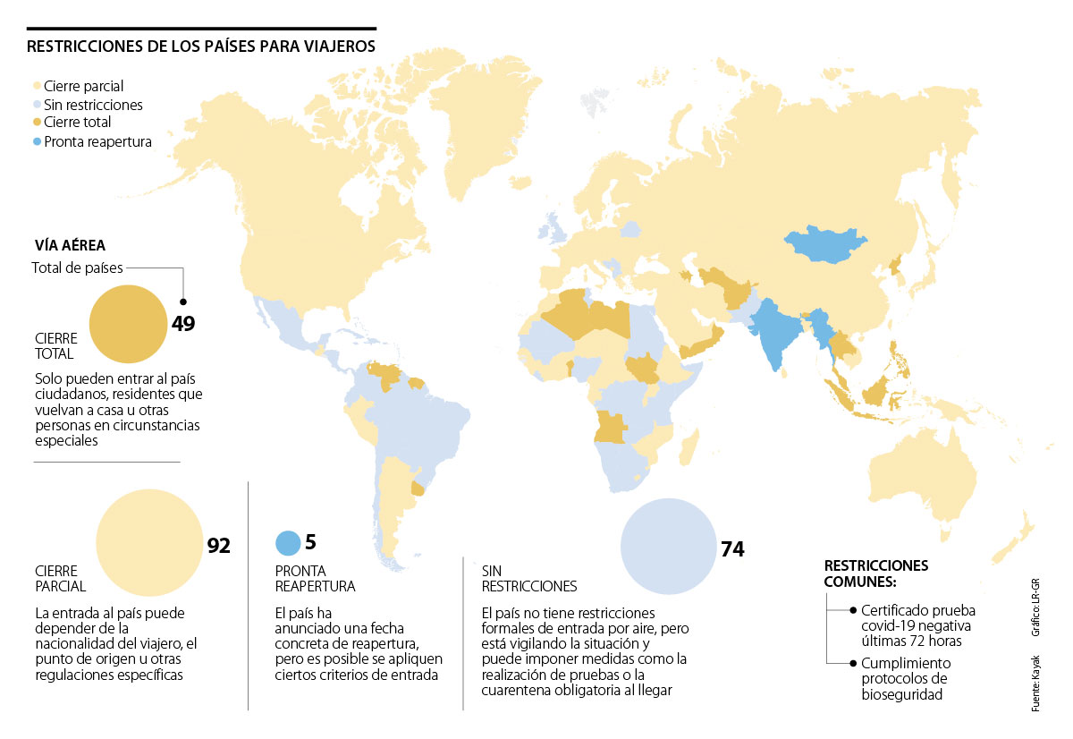 Por suerte, para los turistas, y según contempla Kayak en su mapa interactivo de restricciones, más de 74 países en todo el mundo no tienen ninguna restricción de viaje, salvo, claro está, cumplir con los protocolos de bioseguridad universales como el uso de tapabocas y el lavado de manos.