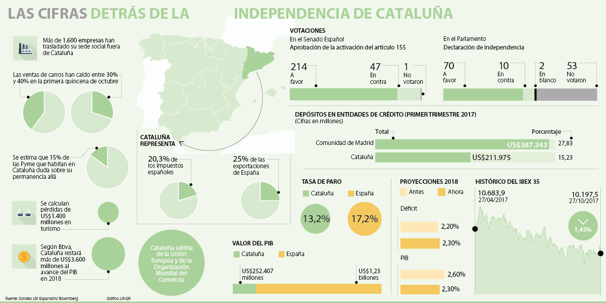 La industria también se ha visto afectada por este mes de crisis. En la primera quincena de octubre, según el Gremio del Motor de Barcelona, las ventas de carros cayeron entre 30% y 40%, mientras que la turística Exceltur considera que podría haber pérdidas por encima de los US$1.200 millones si continúa la caída de las reservas. Desde la celebración del referendo, estas han caído 20%.