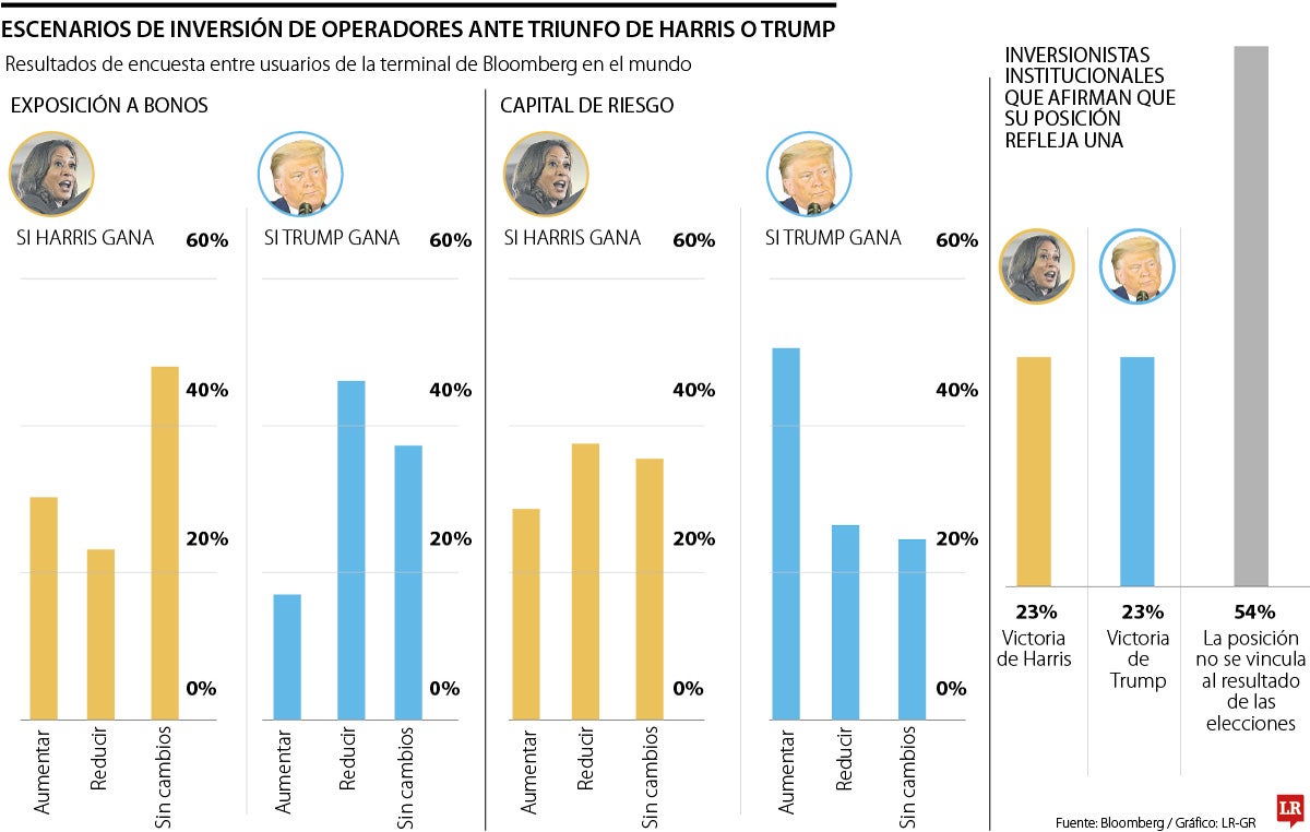Alrededor de un tercio de los encuestados dijo que probablemente mantendría estable su exposición a la renta variable si Harris gana, en comparación con 24% si gana Trump. Aproximadamente la mitad planea mantener sus participaciones en bonos sin cambios con Harris, frente a 37% con Trump.