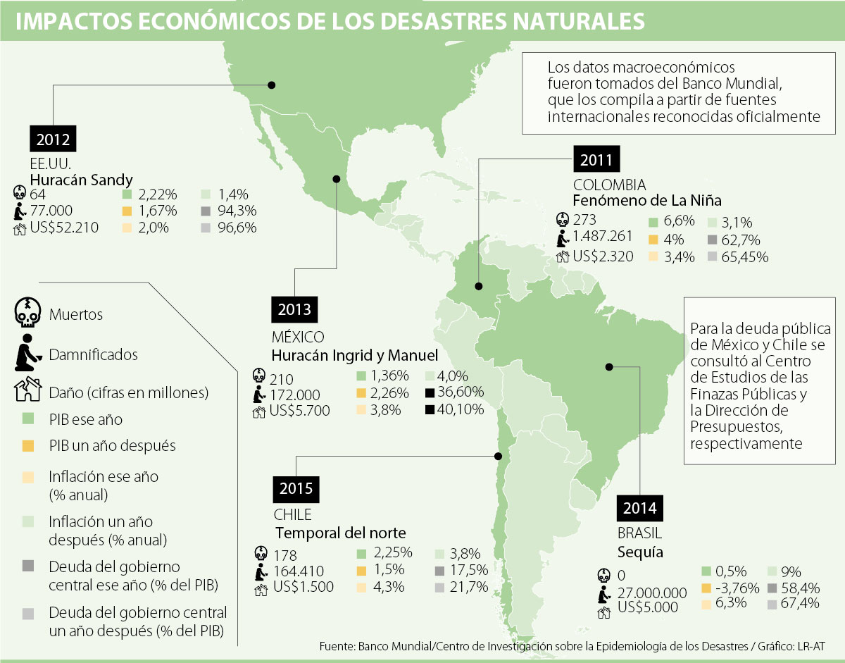 La Organización de Naciones Unidas (ONU) informó que Guatemala, Costa Rica, El Salvador y Nicaragua están entre los 15 países del mundo que corren mayor riesgo en caso de que ocurra una catástrofe. Sin embargo, según la ONU, América Latina tiene tan solo entre 2% y 5% de posibilidades de enfrentar una catástrofe en cualquier año. Desde 2010, hasta lo que va corrido de 2017, el impacto de las pérdidas se ha estimado en US$167.029 millones, según datos del Emergency Events Database. No obstante, aunque el costo de las reparaciones es importante, una gran parte de la incidencia en la economía es la afección a las personas. Cuando ocurre un desastre se retrasa “el posible crecimiento de la región. Entre más duro sea para las personas es más negativo (en lo económico) por el impacto humano”, dijo Óscar Eduardo Medina, profesor de la Universidad Eafit.