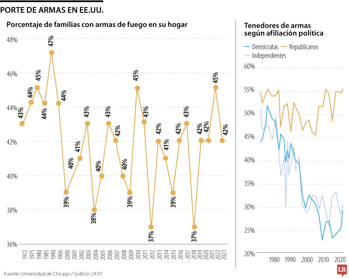 Ahora, 29% de los demócratas o de los que se inclinan por los demócratas dijeron que tenían un arma en casa en 2022, frente al mínimo de cuatro décadas de 22% en 2010, según una encuesta realizada por Norc en la Universidad de Chicago, una organización de investigación no partidista. En 2022, 55% de los republicanos tenía un arma en casa, tres puntos porcentuales más que en 2010, según el sondeo hecho a 3.500 adultos.